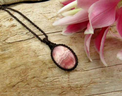 🌹LOVE & HEART OPENING 🌹 Sweet pink Rhodocrosite gemstone macrame necklace - soft, candy pink with gorgeous banding - Rhodocrosite evokes feelings of love, calm, sweetness - so lovely ! From Argentina.