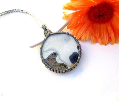Beautiful & intriguing Maligano Jasper macrame necklace ! Rare Maligano Jasper from Sulawesi Island, Indonesia. This piece contains magnificent patterns that resemble a magical, whimsical scene - One of a kind !