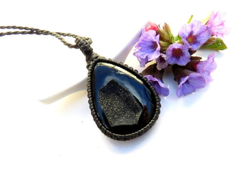 Beautiful black Onyx Druzy macramé necklace - Jet black with a gorgeous twinkling druzy cavern! Druzy is a natural crystallization that occurs on a stone- tiny crystals formed through the heating and cooling process of Mother Earth. Exquisite find! You will receive the exact piece in photos #1-6 and the video. All of our Healing Stones include a description of their healing properties ✨