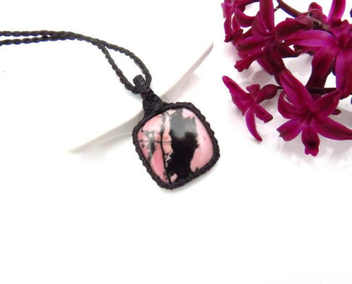 💕THE RESCUE STONE💕 Stunning Rhodonite macrame necklace - the prettiest, rose pink and black Rhodonite with gorgeous patterns - unique shape.