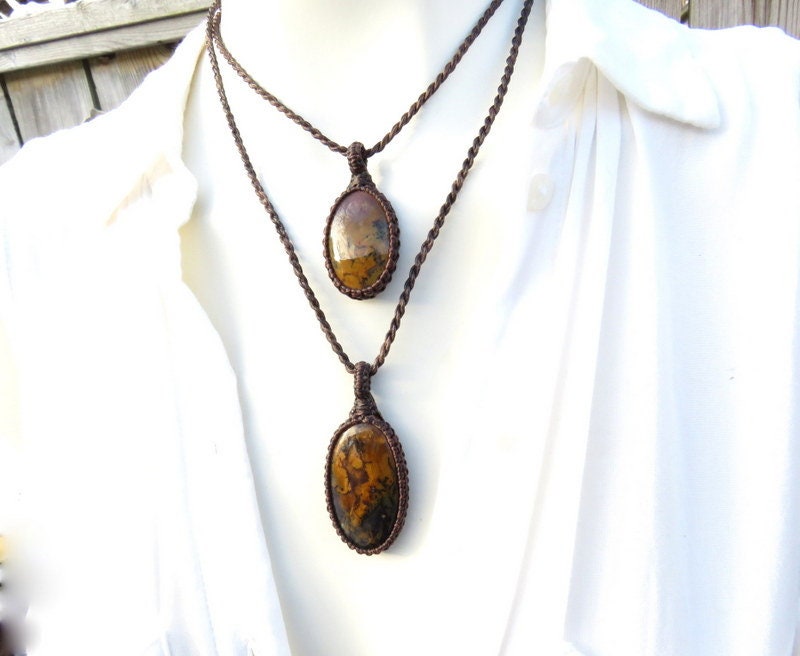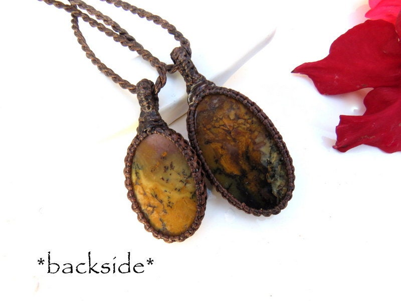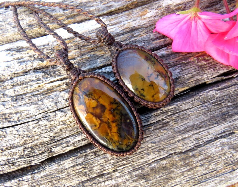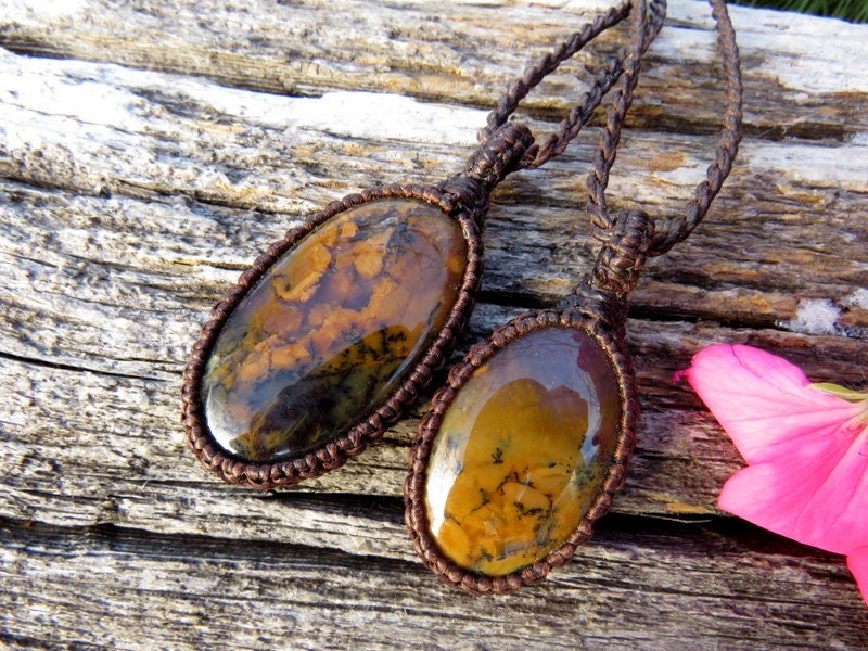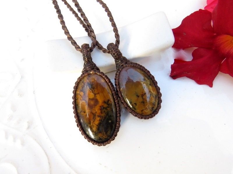 Materials: agate, gemstones, semiprecious stones, waxed cord, dendritic agate.