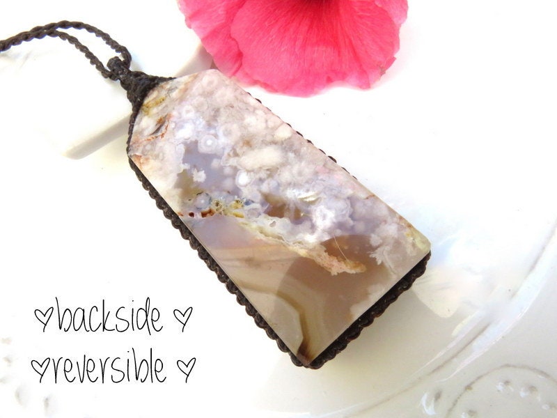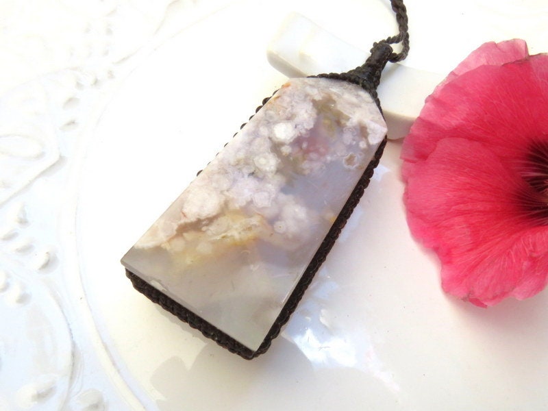 Gorgeous 🌺 Flower Agate 🌺 macramé necklace ! From Madagascar - Its gorgeous plumes resemble cherry blossoms✨ The pinky-peach, beige and gray with pops of orange are GORGEOUS together 😍 with tiny druzy caverns - Also called "Snowflake Agate" - this piece is a generous size. Natural imperfections.