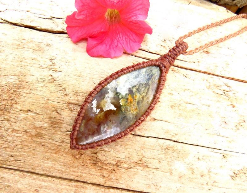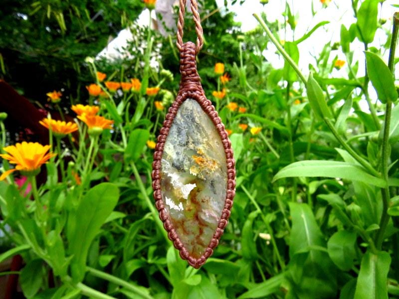 Spectacular Graveyard Plume Agate macrame necklace! Trehis rare Graveyard Plume Agate is found in a seam in a far eastern area of Oregon, USA. This piece is a top quality Graveyard Plume full of enchanting, billowy, colorful plumes. Professionally sourced and cut designer cab - don't miss this one! ✨💎