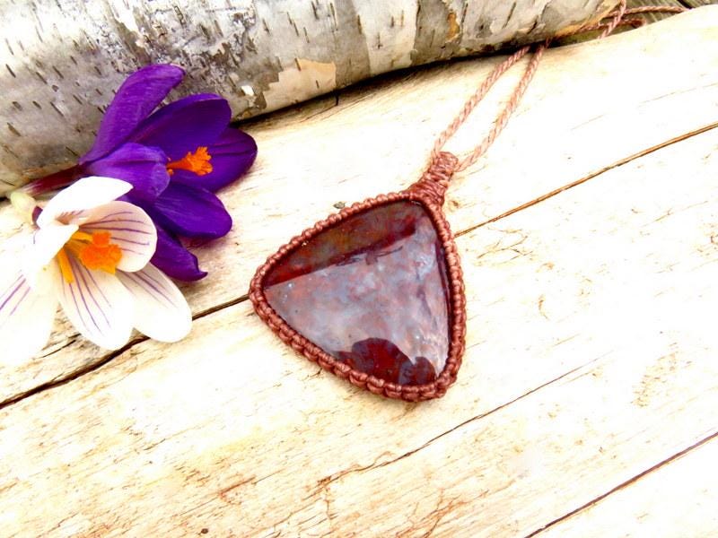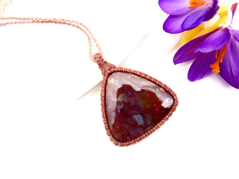 Deep red Plume Agate macrame necklace - Plume Agate contains branching mineral inclusions and patterns that resemble feather - like plumes, moss, little trees or other vegetation. A great gift for the gardener or nature lover 🌳 🌿