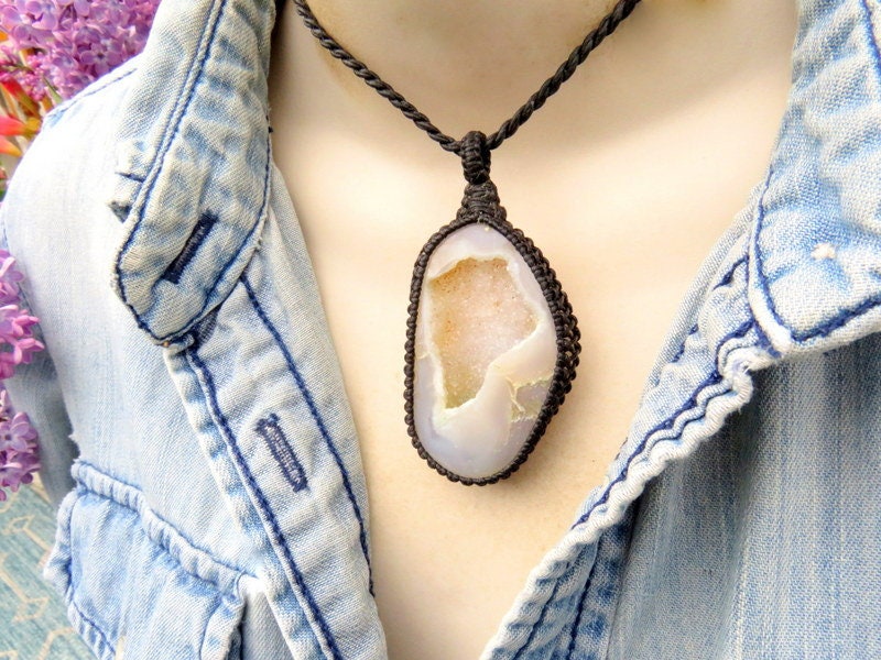 Materials: agate, gemstones, stones, semiprecious stones, agate druzy, agate geode, waxed cord.