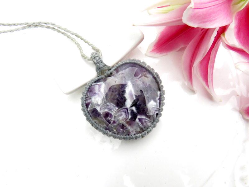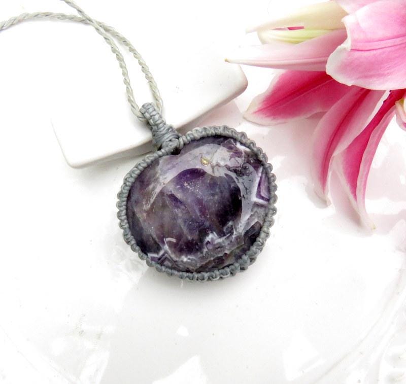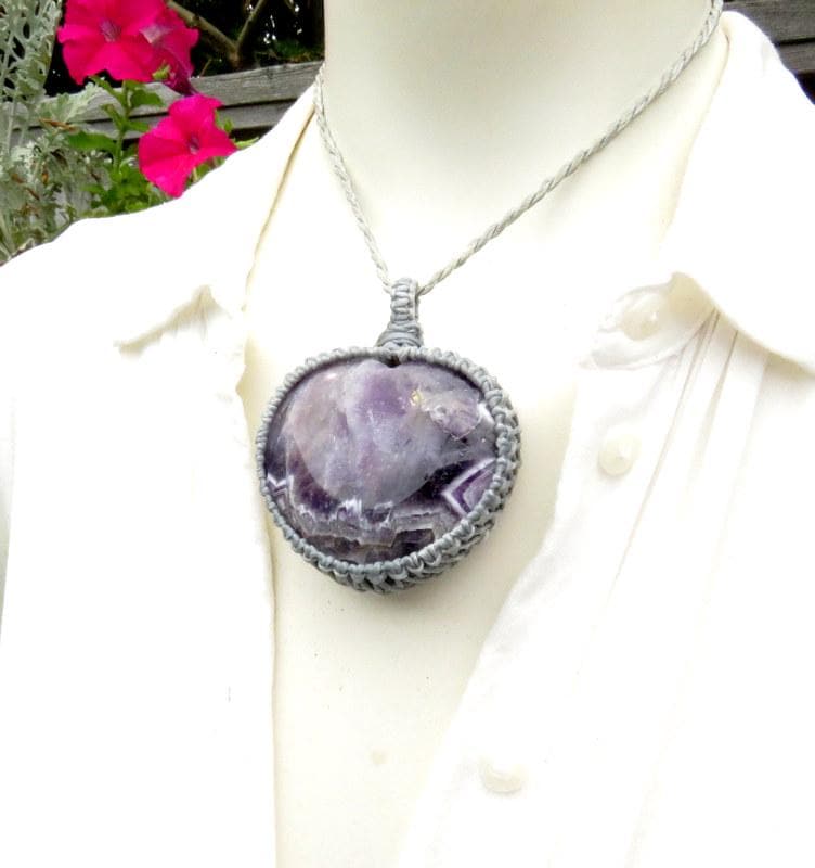Materials: amethyst, stones, gemstones, semiprecious stones, waxed cord, dream amethyst, chevron amethyst.