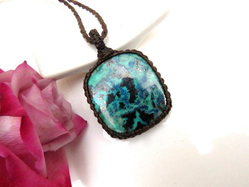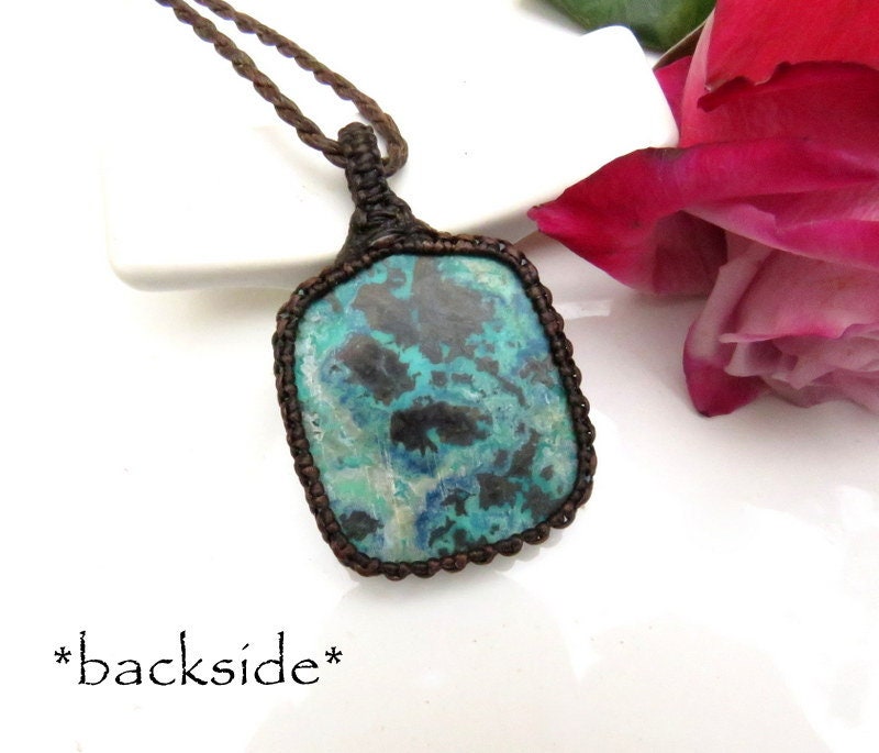 Quality Azurite macrame necklace - pretty azure blue & green Azurite with dark metallic areas - inclusions of Shattucktite and Chrysocolla as well - unique shape! *You will receive the exact stone in photos #2-8 and the video.