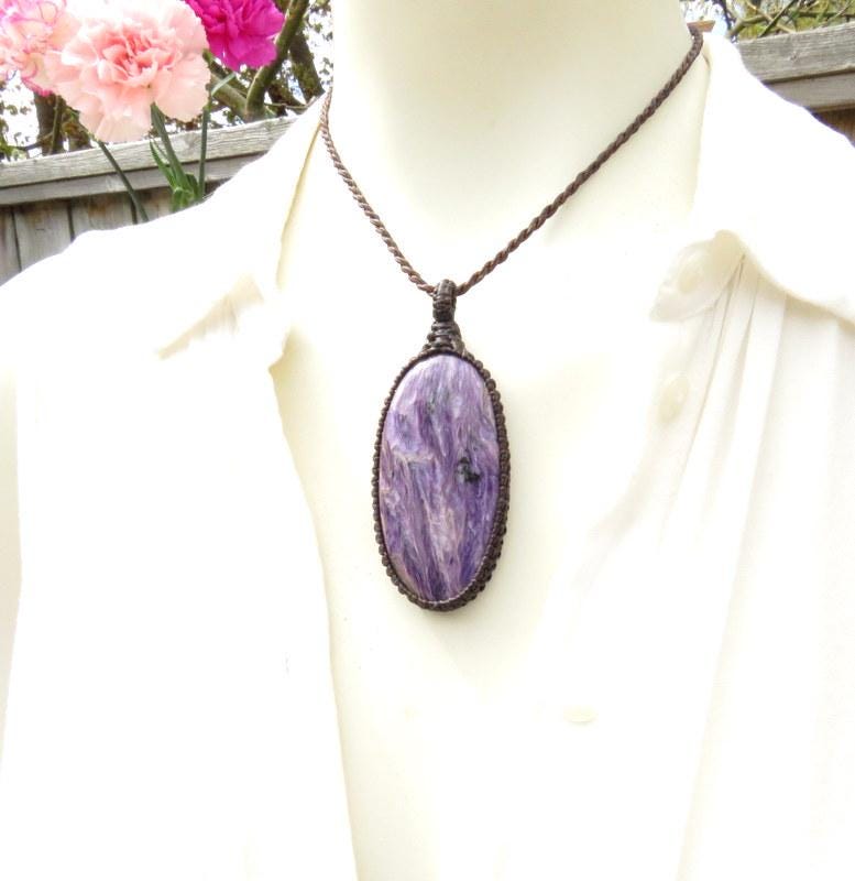 Exquisite! Russian Charoite macramé necklace - Deep, electric purple, cool patterns and a unique shape. A wonderful piece to add to your gemstone collection! Charoite is only found in the Charo River area of Siberia.