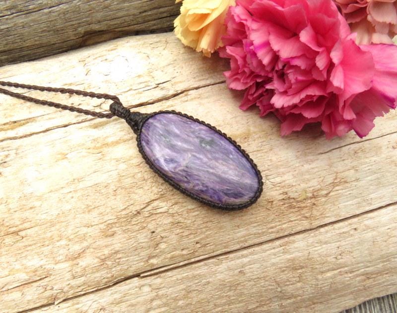Materials: charoite, waxed cord, cabochon, semiprecious stones, gemstones.
