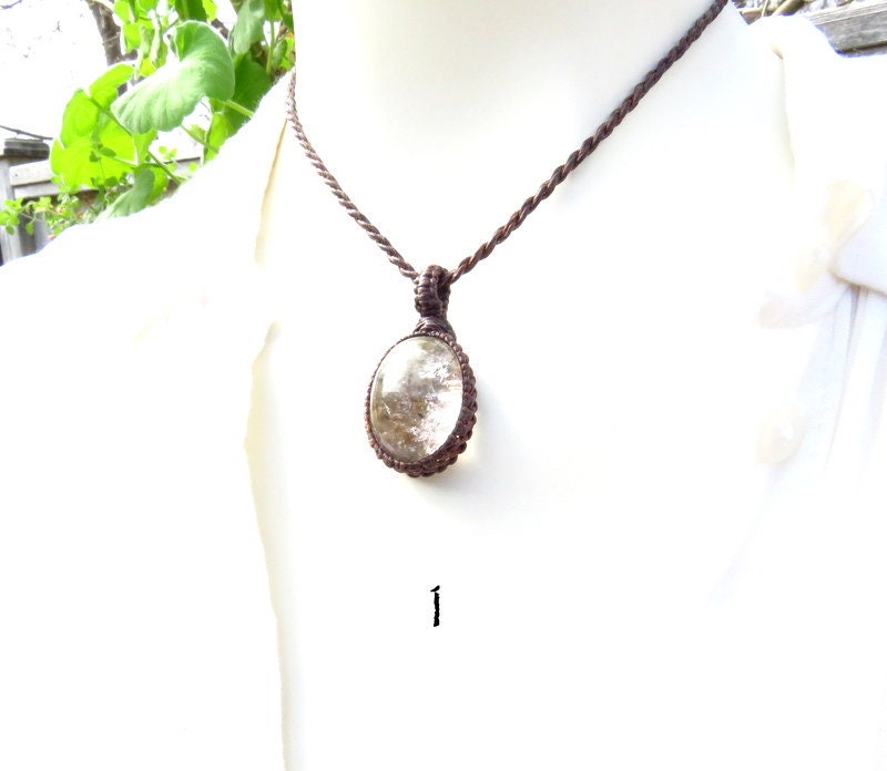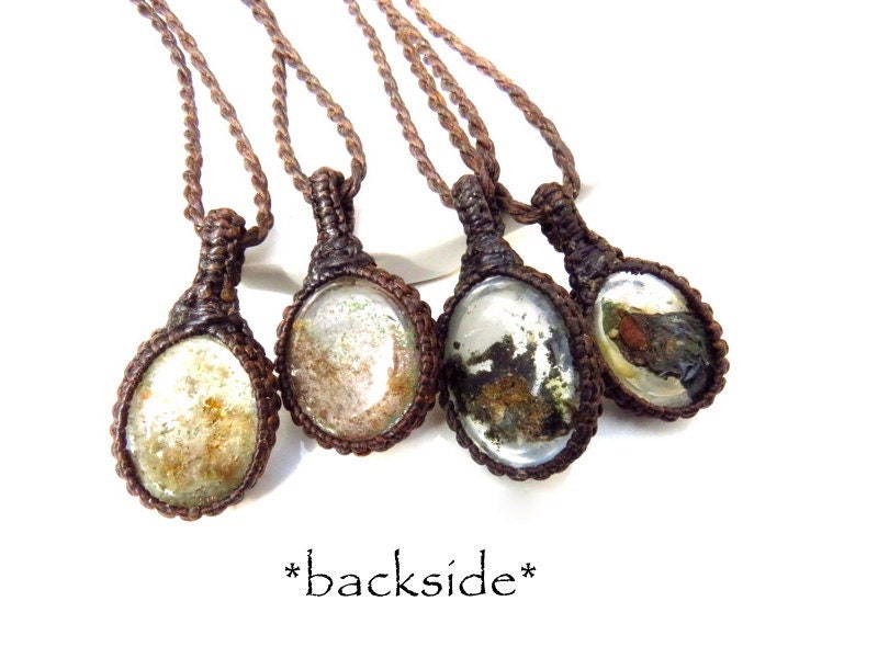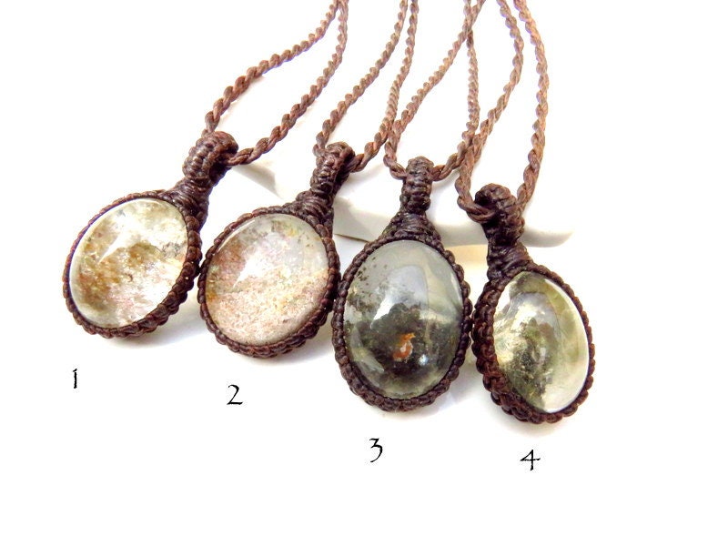 You choose ! Sweet & dainty Garden Quartz macrame necklace - Intriguing mineral inclusions make Garden Quartz a very fun crystal to gaze at - Also known as Lodalite or Shamanic Dream Quartz . It was formed millions of years ago in Brazil. The colorful mineral inclusions give the look of a magical garden landscape...Brazilian folklore tell the story of fairy and elves living inside the ' garden ' of the Quartz . A perfect piece for the gardener or fairy lover! *You can choose the Garden Quartz necklace(s) that you wish from the drop down menu. The size and price of each is also listed there.