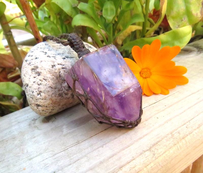 Materials: amethyst, gemstones, semiprecious stones, waxed cord, crystal.