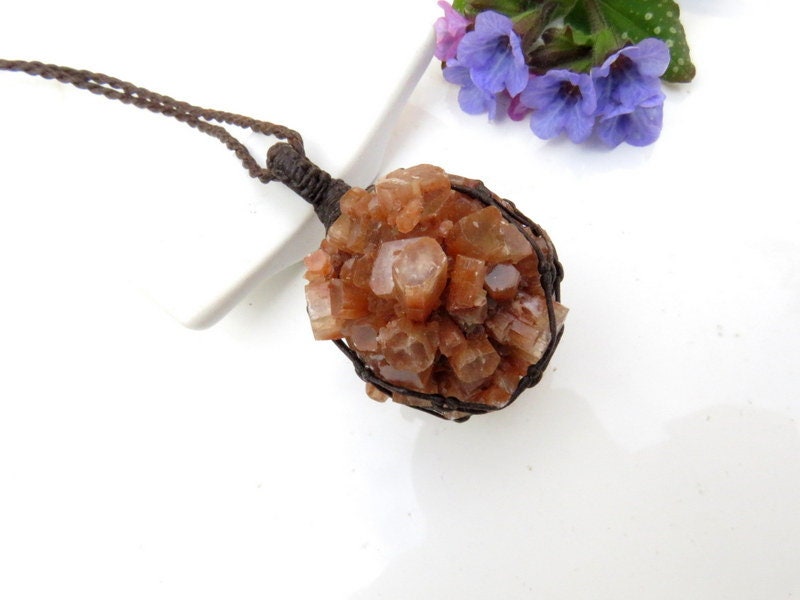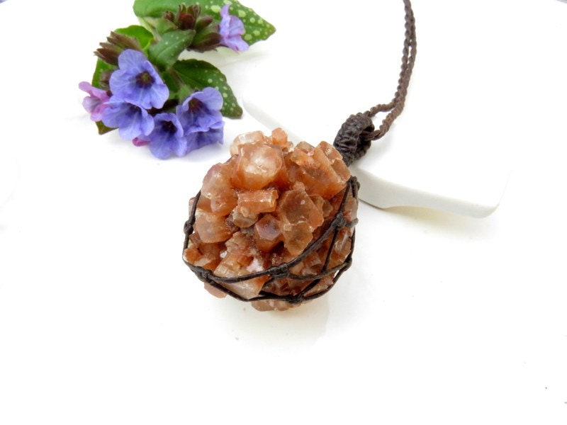 Pretty Aragonite Crystal necklace - gorgeous cluster of peachy brown crystals - very shiny and gemmy - a crystal that demands many hours of gazing ! You will receive the exact crystal in photos #1-6 and the video.