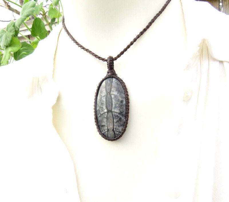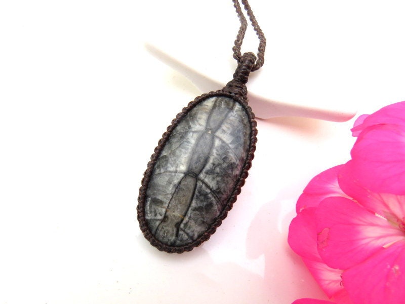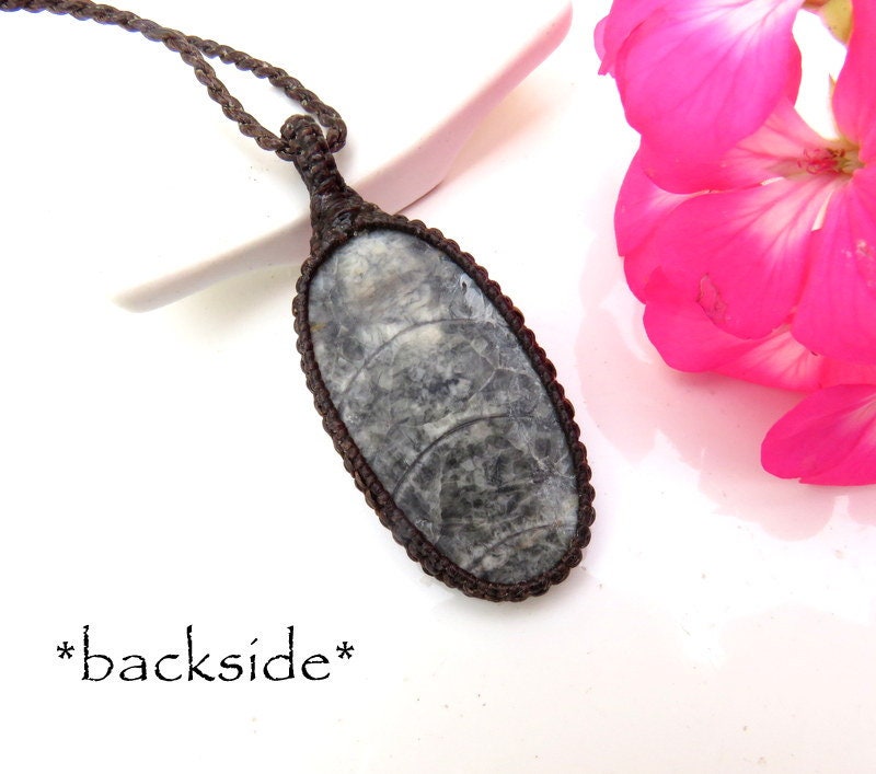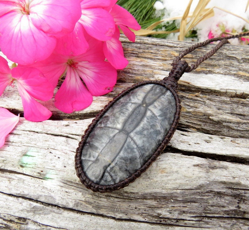 Unique Orthoceras Fossil macrame necklace - Orthoceras fossils have been found dating back to the Ordovician period ( 400+ million years ago) Even though they were among the earliest forms of life, this class of nautiloid is still considered to be one o f the most intelligent forms of ocean life. Fossils (from Latin fossus, literally ”having been dug up”) are the preserved remains or traces aces of animals, plants, and other organisms. In ancient times believed to be a gift from the stars and because of their age they have been used throughout the centuries as a talisman for protection and long life.