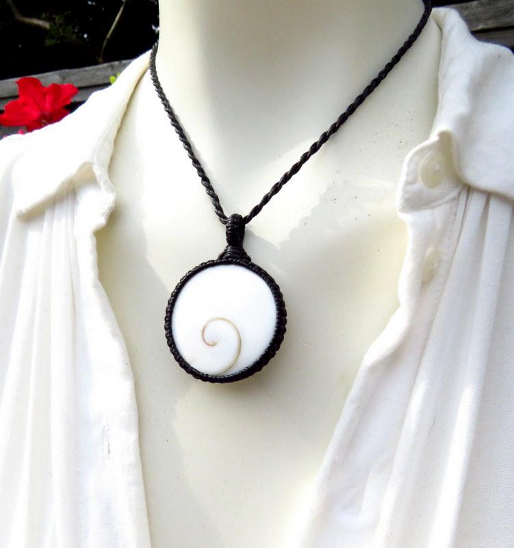 Big and beautiful Shiva Eye Shell macrame necklace - brilliant, pure white with a lovely brown spiral pattern. A Shiva eye shell, also known as a Shiva's eye or Pacific cat's eye, is a stunning and unique natural gemstone. It is the protective operculum, or 'trapdoor,' of the Turban snail (Turbo smaragdus) found in the Indian Ocean, particularly in the shallow coastal waters of Thailand, Indonesia, and Australia. The Shiva eye shell is renowned for its distinctive appearance, characterized by a mesmerizing spiral pattern on its surface which resembles an enigmatic and alluring eye. A very unique gemstone for your collection !