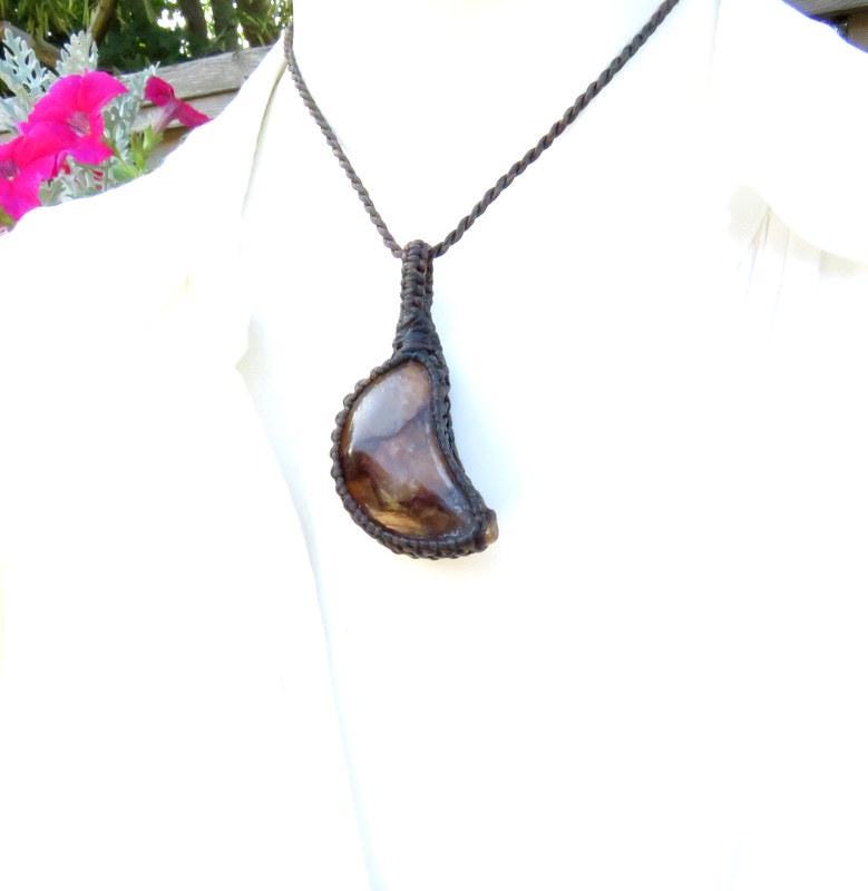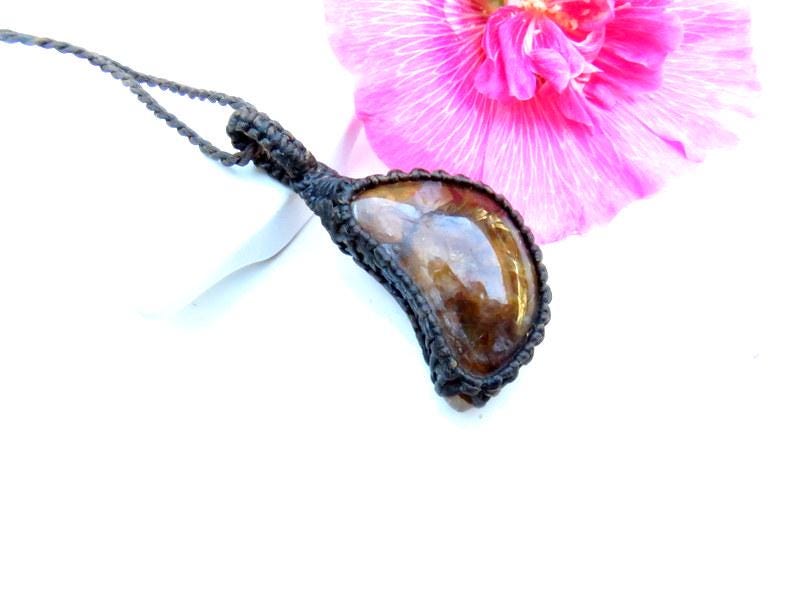 == The macramé design covers the perimeter of the stone - we do not cover the back so the stone can touch or sit close to the skin