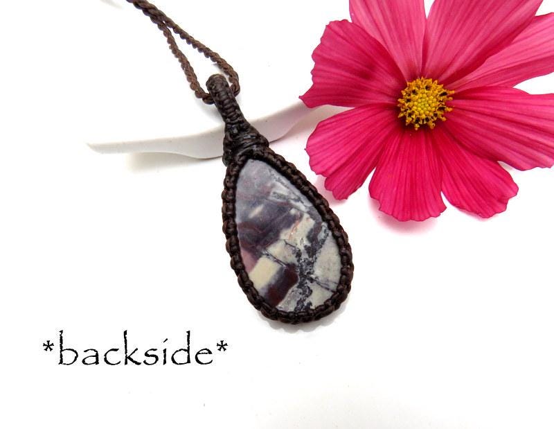 🌹So pretty ! Exotica Jasper Macrame Necklace - also known as 'Sci -fi Jasper.' A breathtaking gemstone that embodies the beauty of nature’s palette. With its rich, earthy tones and intricate patterns, it resembles a vivid landscape painted by an artist's brush. The stone showcases a mesmerizing mix of deep purple, grays and brown - swirling together in unique formations that tell a story of their own.