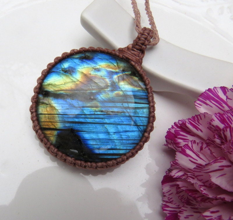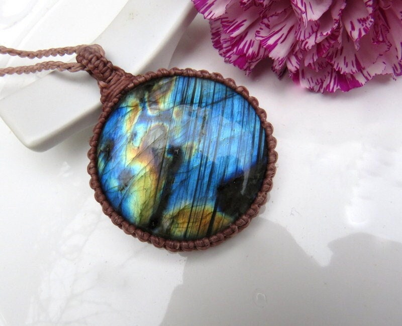 TRANSFORMATION & CHANGE 💎 Exquisite Labradorite macrame necklace - fiery, electric blue with gorgeous flashes of orange ! Classic round shape and a generous size - Simply Divine ! You will receive the exact piece in photos #1-6 and the video.