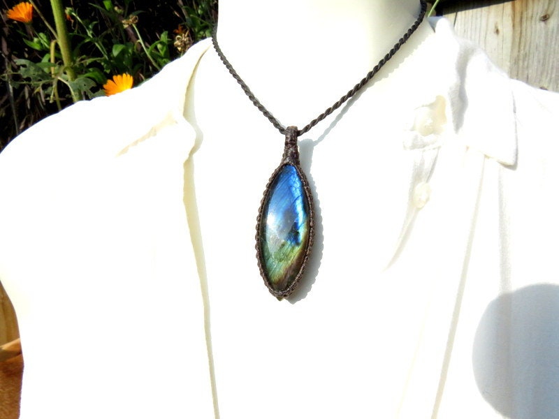 Beautiful Labradorite macrame necklace - Labradorite is a beautiful and highly sought-after mineral known for its stunning play of colors which often resemble the northern lights or an iridescent peacock feather. This lovely Labradorite gemstone necklace has a stunning landscape of electric blue, green, golden yellow and orange. Gorgeous marquis shape.