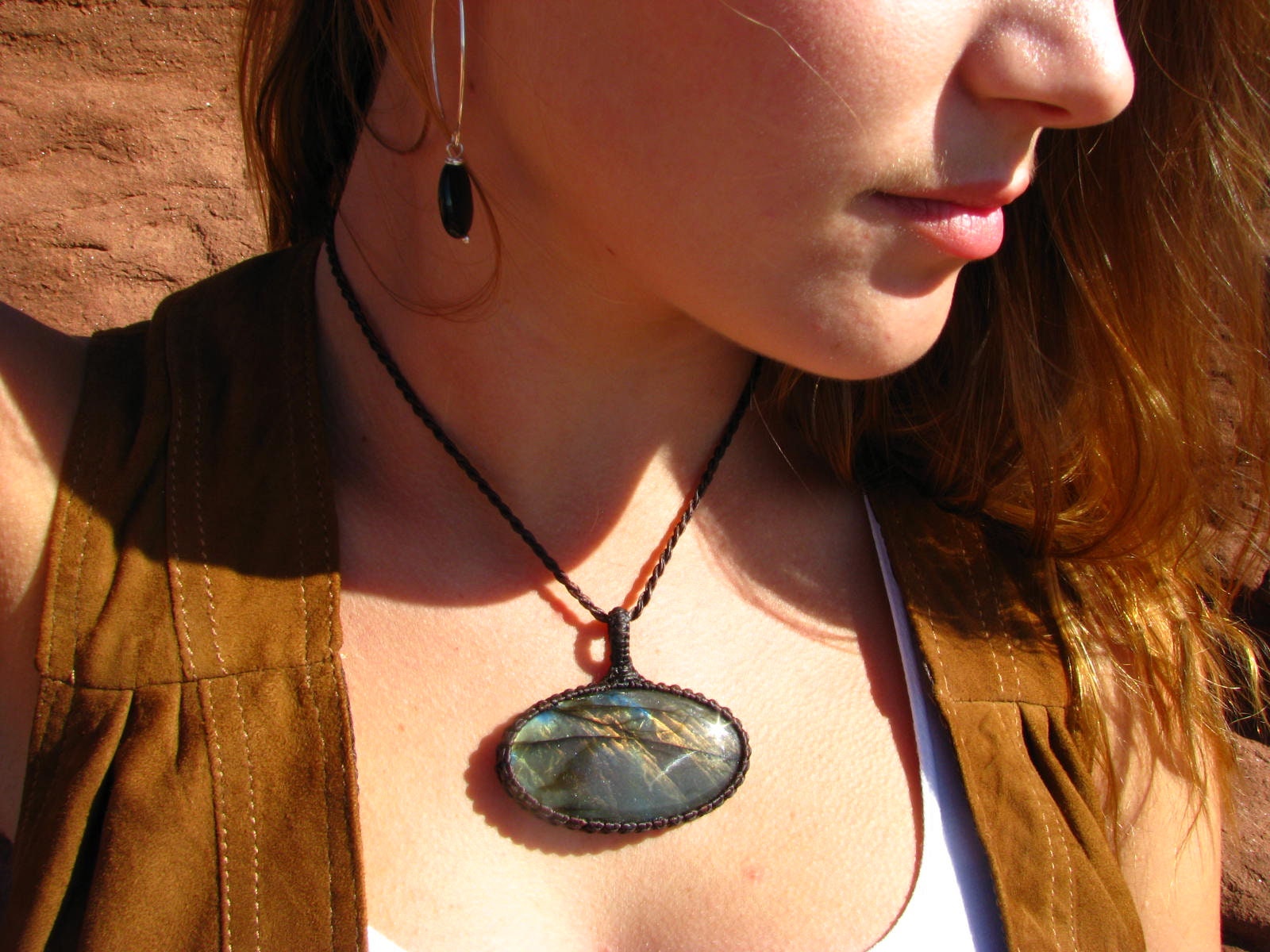 Materials: labradorite, stone, waxed cord, gemstone.