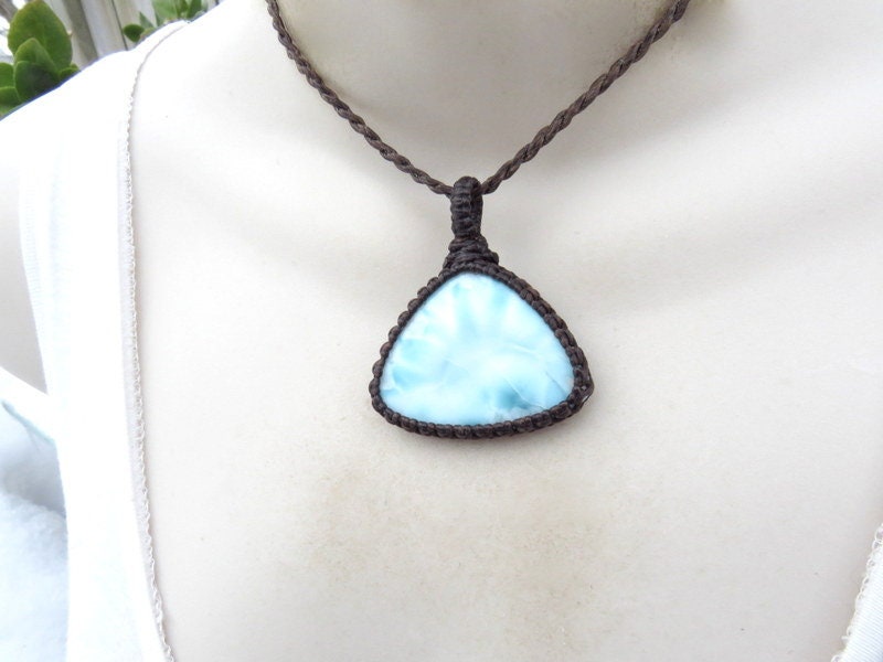 PEACE, LOVE & SERENITY 💎✨Perfection✨ Beautiful Larimar macrame necklace - Also known as the 'Dolphin Stone' - the prettiest Caribbean blue with its distinctive honeycomb pattern that resembles rippling ocean waves - only found in the Dominican Republic and mined only by hand - in a very difficult area to access- Larimar is considered to be among the rarest gemstones in the world. Psychic Edgar Cayce (1877 - 1945). predicted that on one of the Caribbean islands a blue stone would be found with extraordinary healing attributes and it is believed that Larimar is the stone that Cayce was speaking of. ✨ You will receive the exact stone in photos #1-5