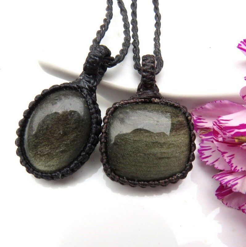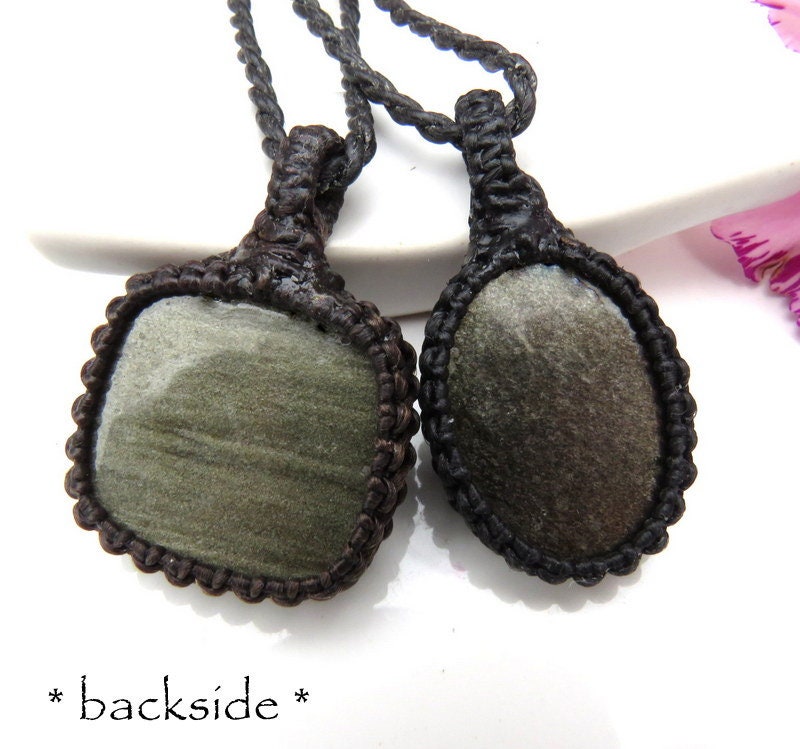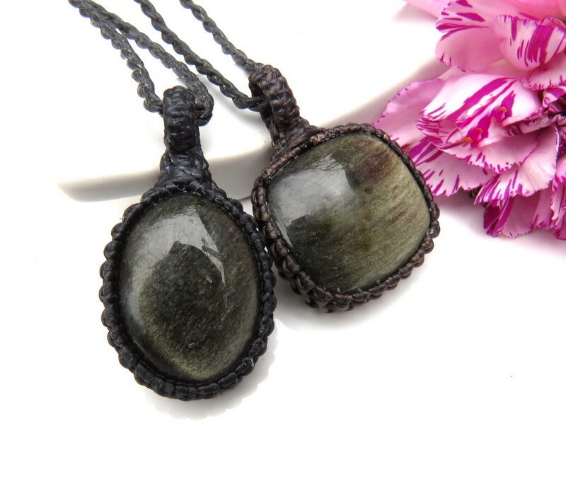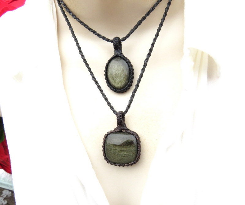 This listing is for a very pretty Sheen Obsidian macrame necklace set- You will receive TWO Obsidian necklaces ! Both Obsidians have a gorgeous golden sheen. Obsidian is said to help with matters of the heart 🌹 We are showing the set with the 18 inch and 22 inch cord lengths. If you wish to wear these as the layered look, you will need to order two different cord lengths. Let us know in the 'notes to seller' box at checkout which cord lengths that you prefer. **Please note: One piece is wrapped in dark brown cord and the other in black cord.
