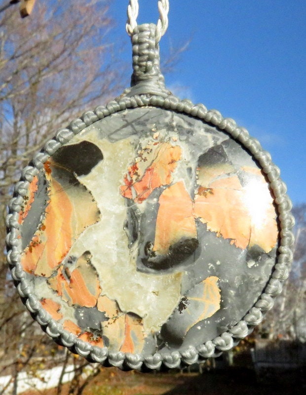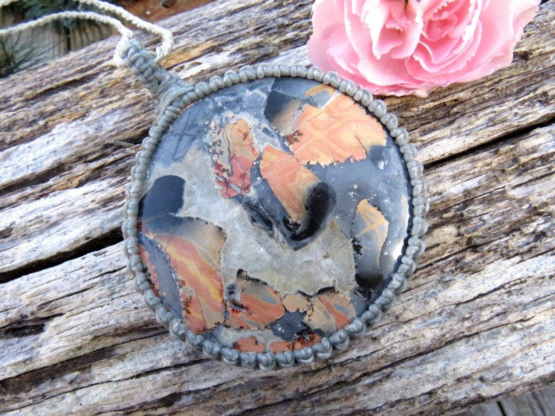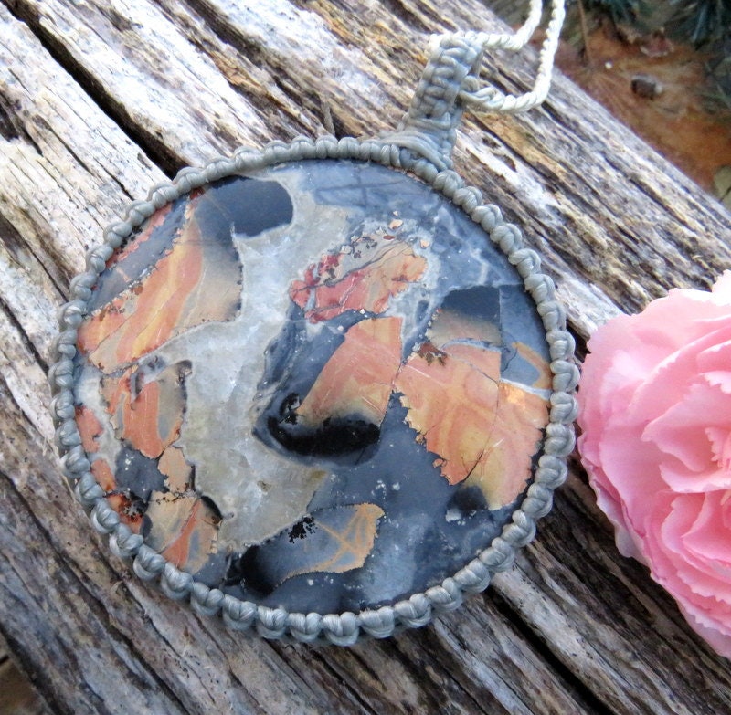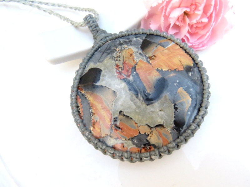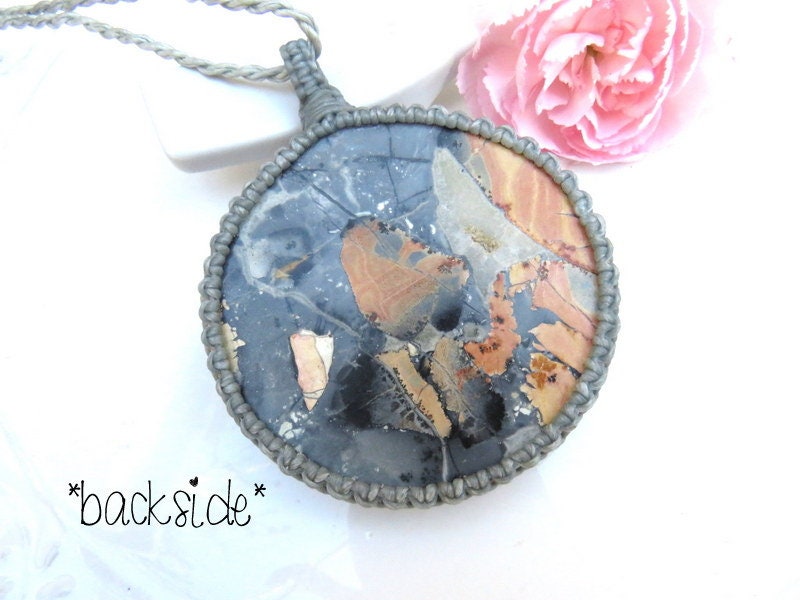 Magnificent Maligano Jasper macrame necklace ! Rare Maligano Jasper from Sulawesi Island, Indonesia. This stunning and rare Jasper has very unique patterns and colors - soothing gray with peachy orange! Very generous size ✨💎