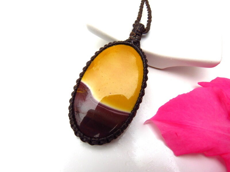 Gorgeous Mookaite macrame necklace- deep burgundy wine and bright yellow - classic oval shape. Mookaite is found only in western Australia - the name 'Mooka' is an Aboriginal word for 'running water'. You will receive the exact piece in photos #2-6 and the video (model is wearing a different but very similar Mookaite)