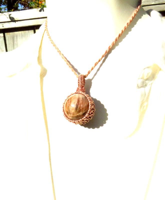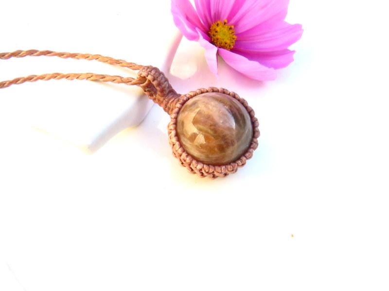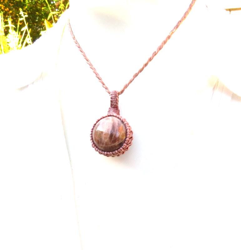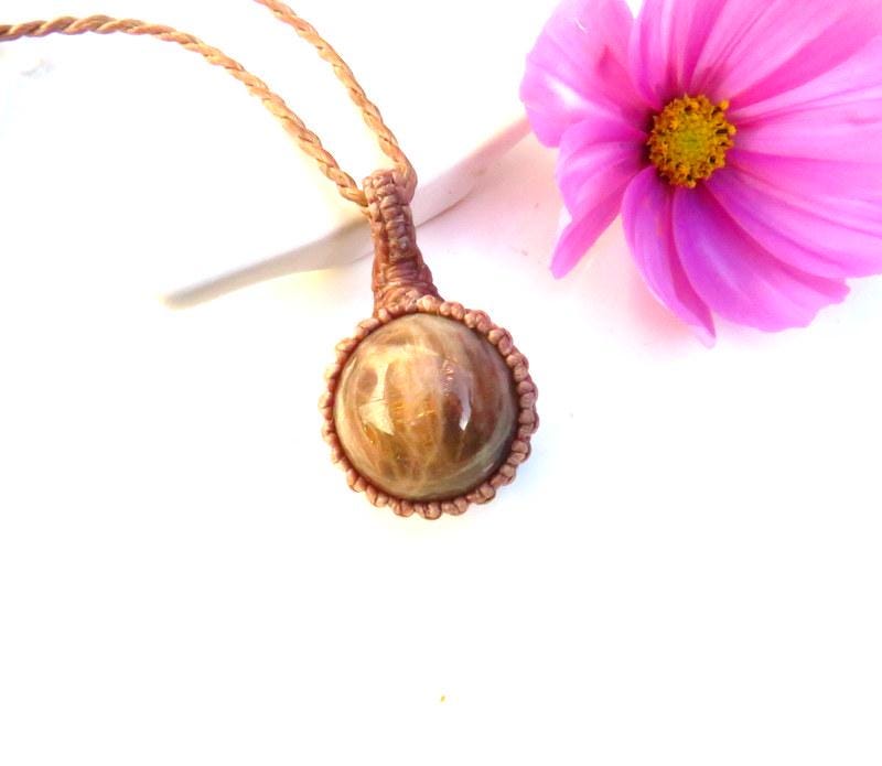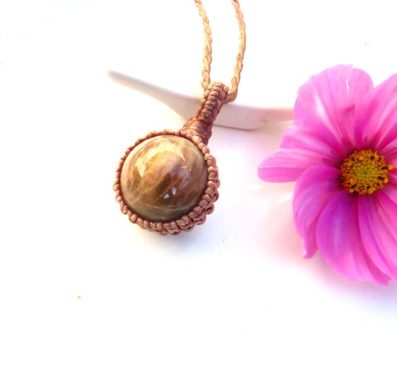 Peach Moonstone sphere necklace, Golden Shine Sunstone macrame necklace