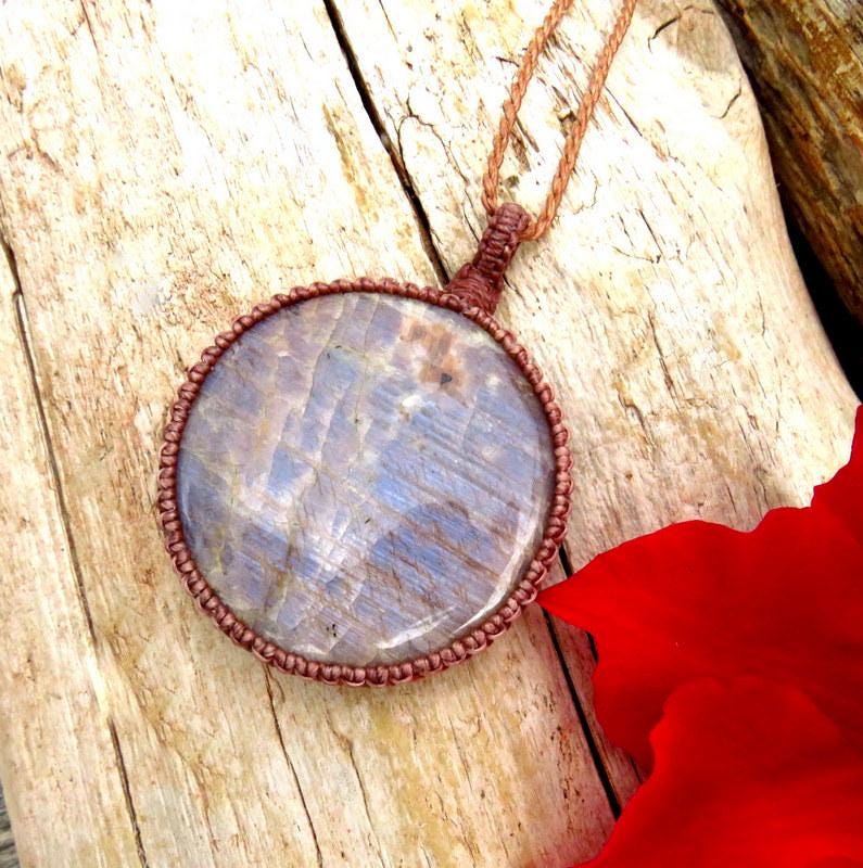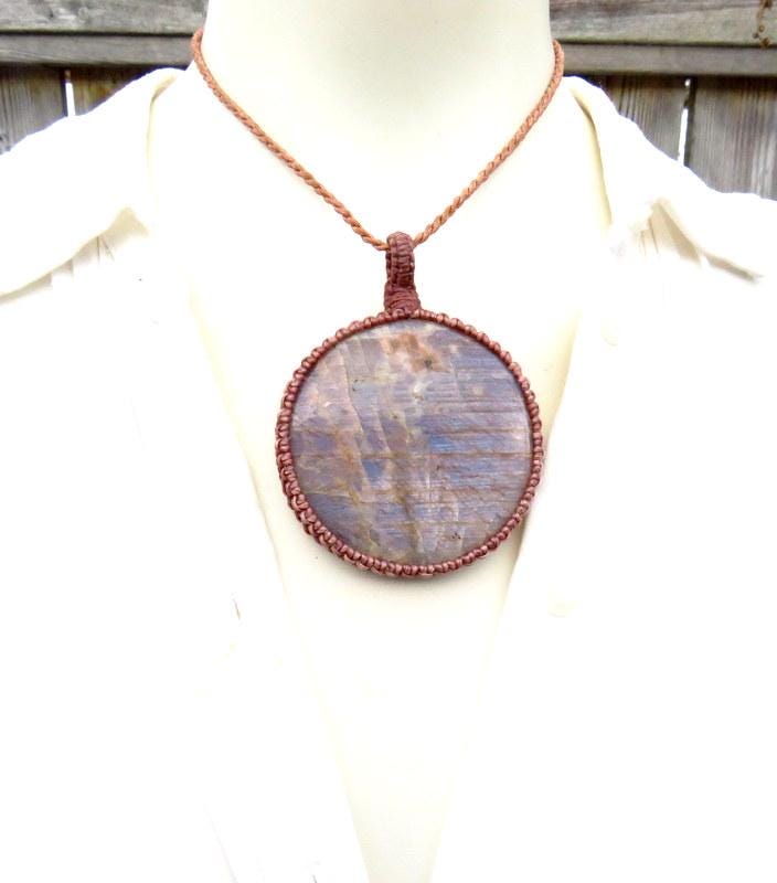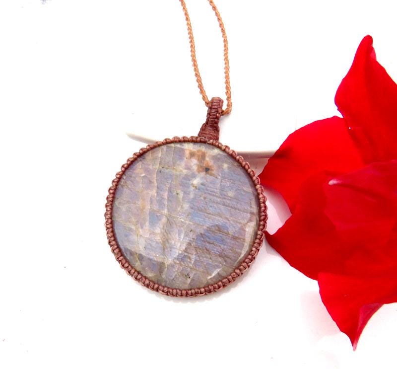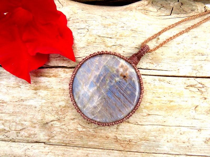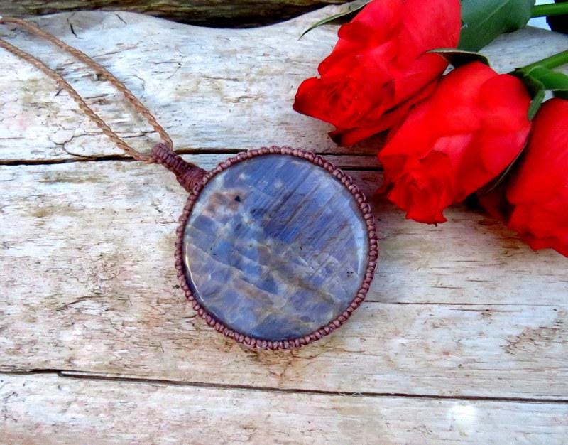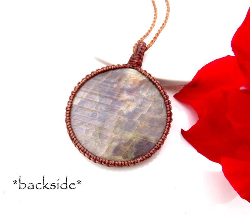 Belomorite and Sunstone macrame necklace, blue moonstone