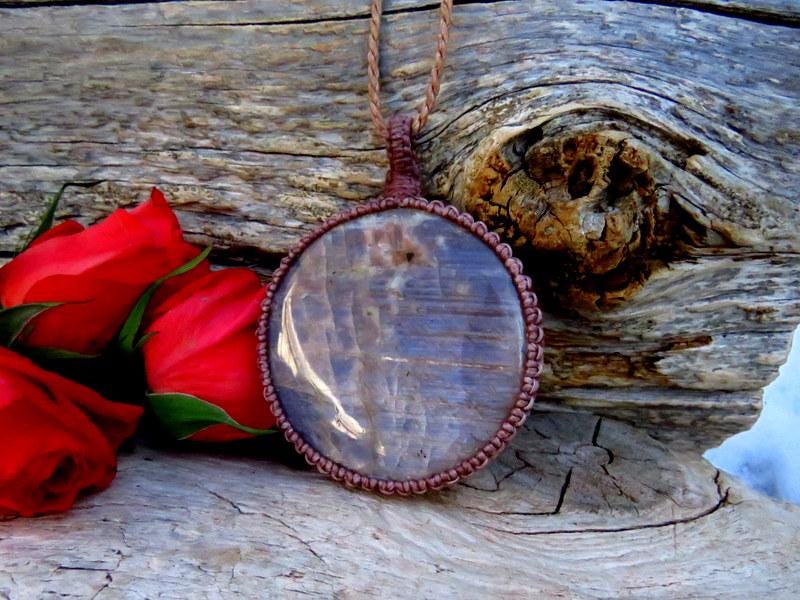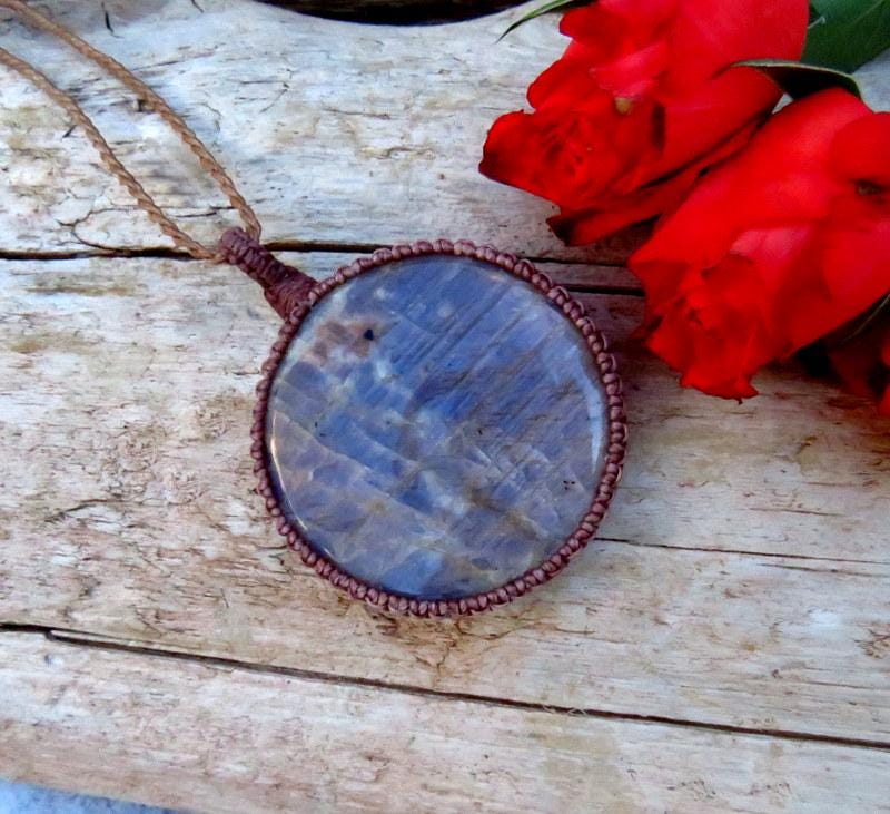 Spectacular Belomerite and Sunstone macrame necklace ! Belomerite is a unique variety of blue Moonstone (Feldspar) from North Karelia, Russia...near the White Sea. This gemstone also includes warm, shimmering Sunstone and, with its beautiful facet cut, there is so much twinkle ✨