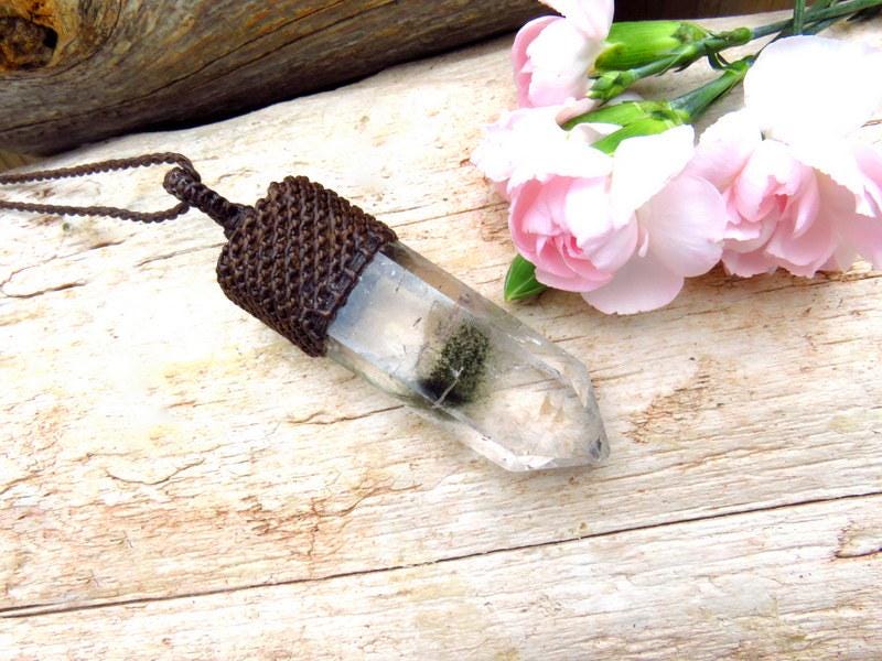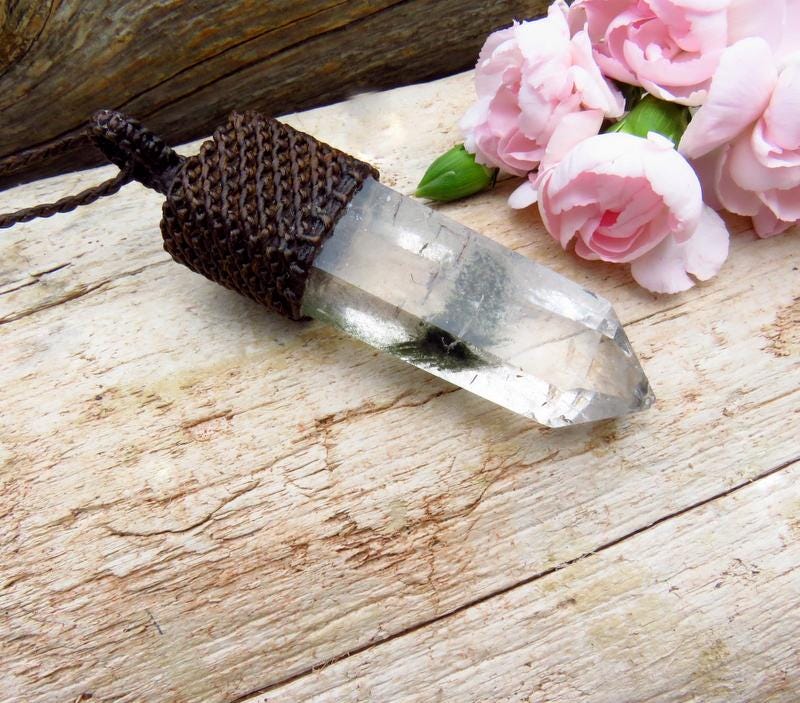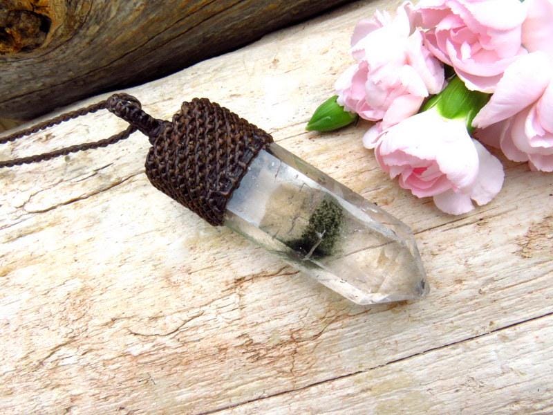 An exceptional Lodolite crystal point necklace - Intriguing mineral inclusions make this a very fun piece to gaze at - all encased in a gorgeous Quartz crystal globe. Also known as " Garden Quartz " - this Quartz crystal has deep, forest green mineral inclusions resembling moss 🌿 A very generous size !