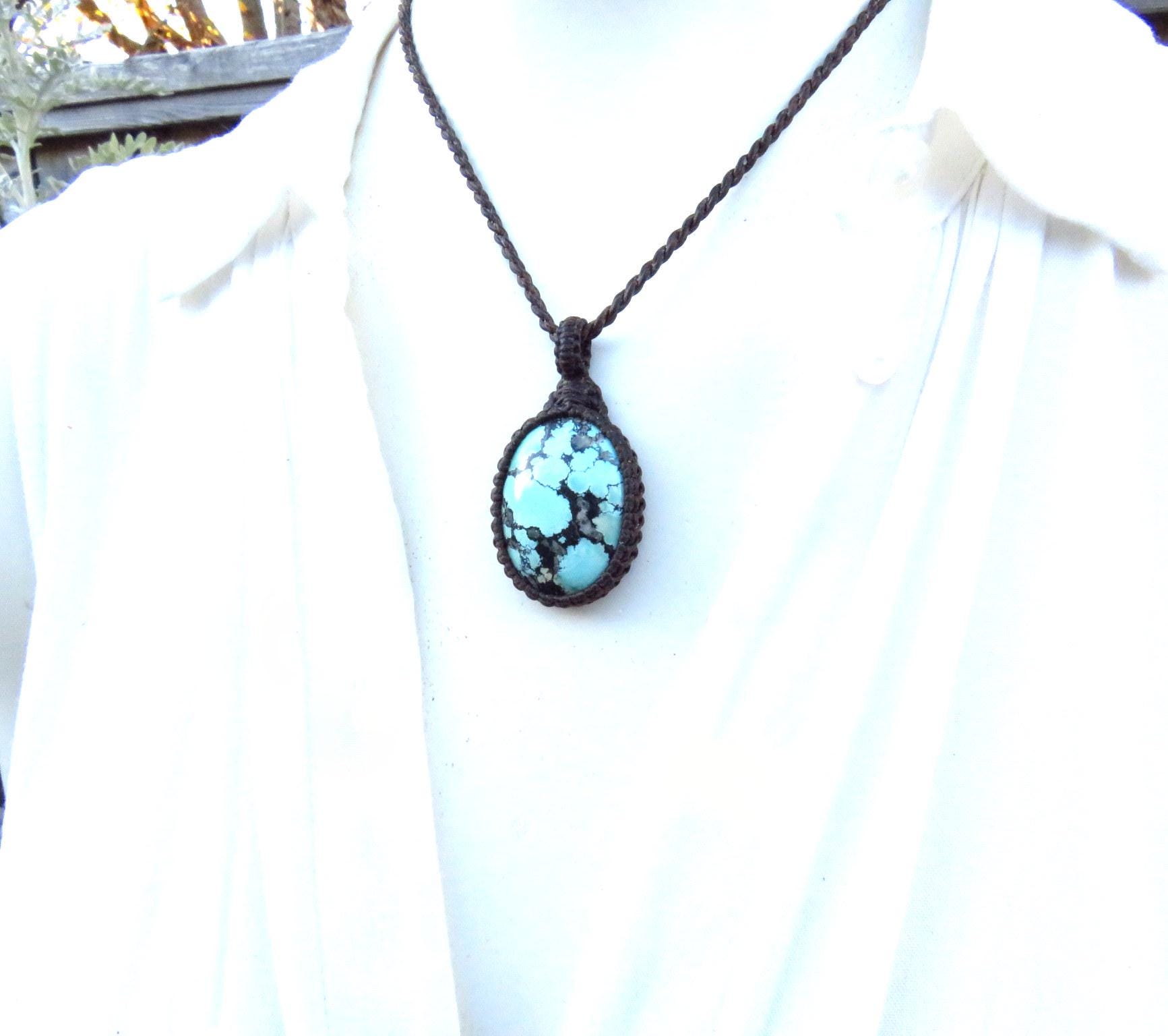 Beautiful Cloud Mountain Turquoise macrame necklace - beautiful color and web patterns ! Cloud Mountain Turquoise comes from a mine in the Hubei Province in central China that has been the most prolific Turquoise mine in Asia.