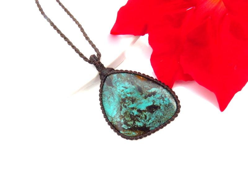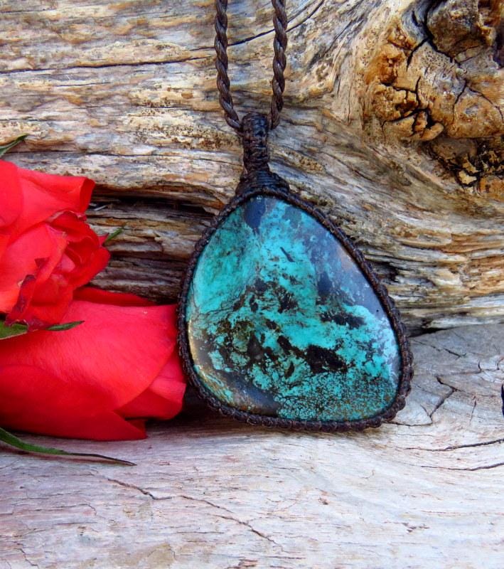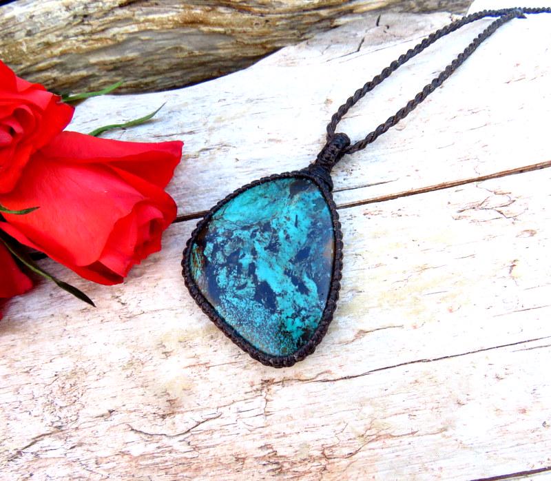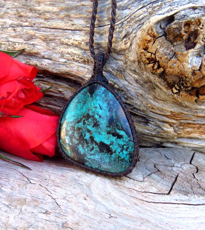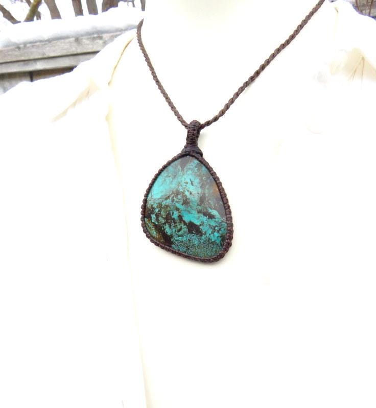 Beautiful Cloud Mountain Turquoise macrame necklace - beautiful color and web patterns and a very generous size ! Cloud Mountain Turquoise comes from a mine in the Hubei Province in central China that has been the most prolific Turquoise mine in Asia. ✨