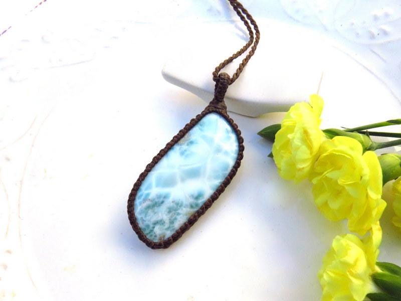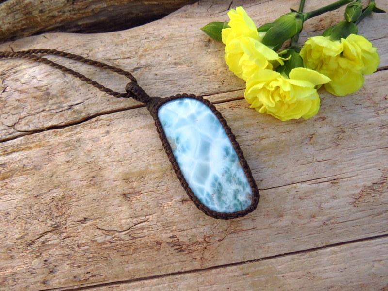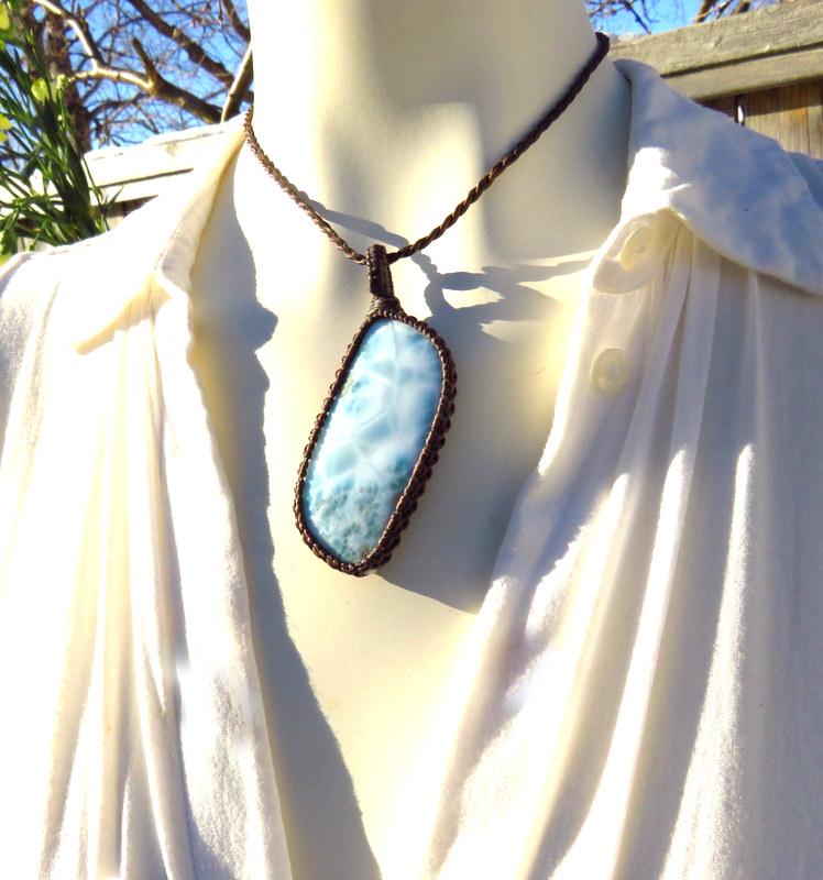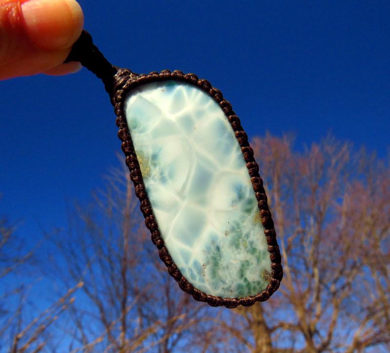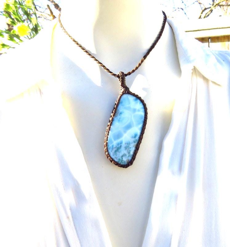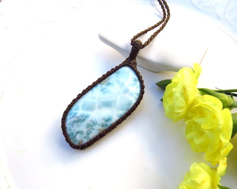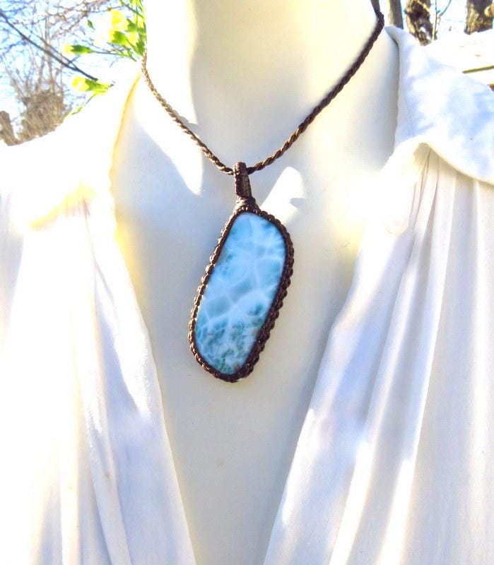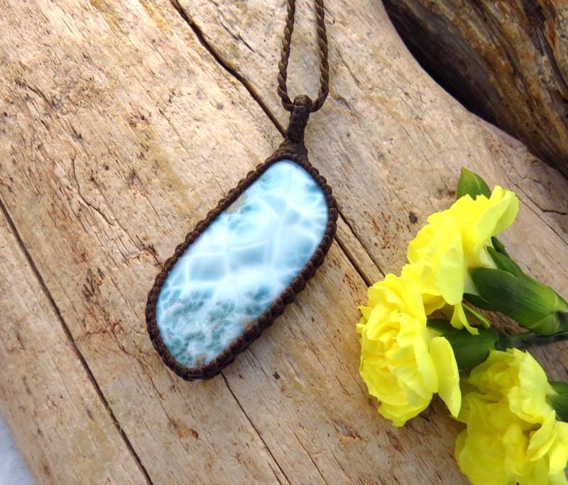 PEACE, LOVE & SERENITY 💎✨Perfection✨ Beautiful Larimar macrame necklace - Also known as the 'Dolphin Stone' - the prettiest Caribbean blue with its distinctive honeycomb pattern that resembles rippling ocean waves - only found in the Dominican Republic and mined only by hand - in a very difficult area to access- Larimar is considered to be among the rarest gemstones in the world. Psychic Edgar Cayce (1877 - 1945). predicted that on one of the Caribbean islands a blue stone would be found with extraordinary healing attributes and it is believed that Larimar is the stone that Cayce was speaking of.