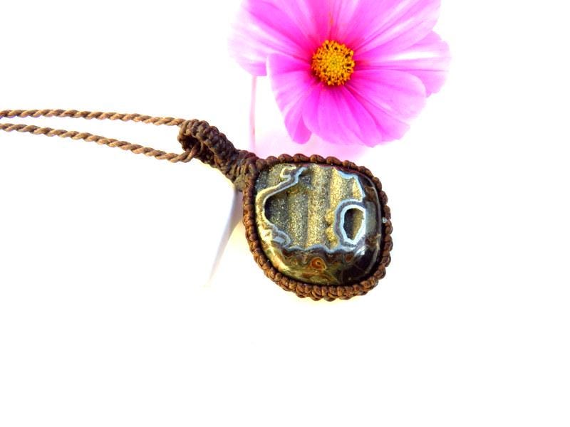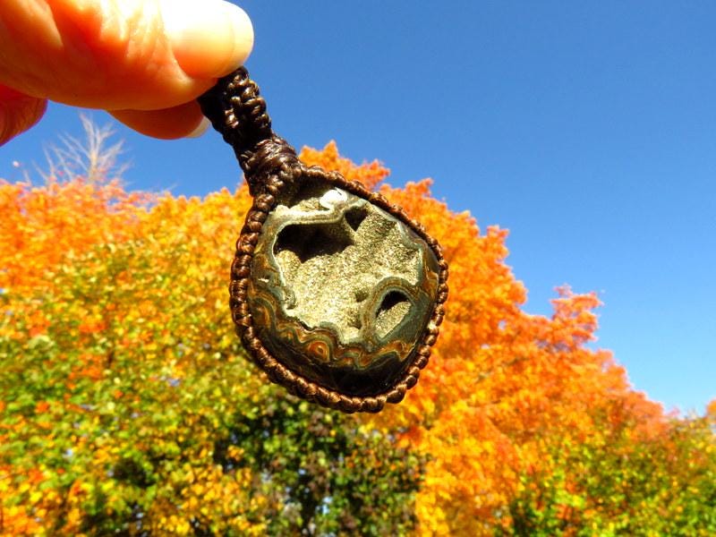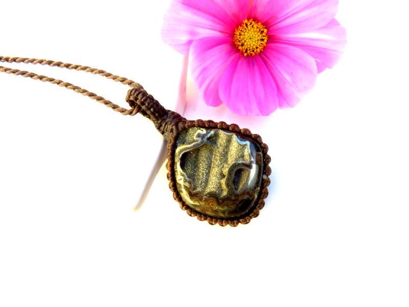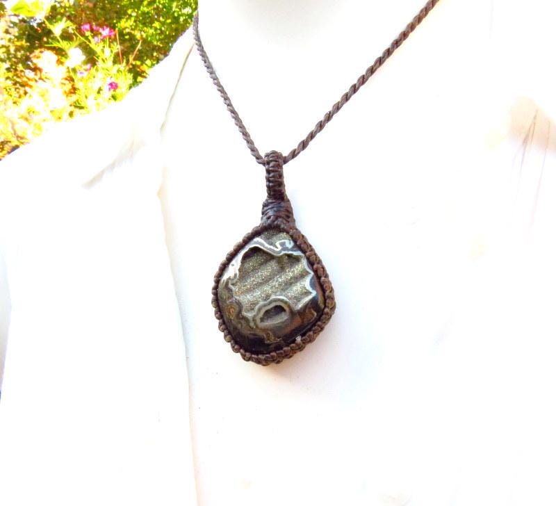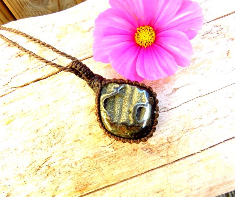 Spectacular and rare Pyritized Ammonite macrame necklace - both a gemstone and a fossil! Taking over 80 million years to form, it is extracted only in the territory of the Ulyanovsk region on the bank of the Volga River. This piece is an absolute treasure ! ✨