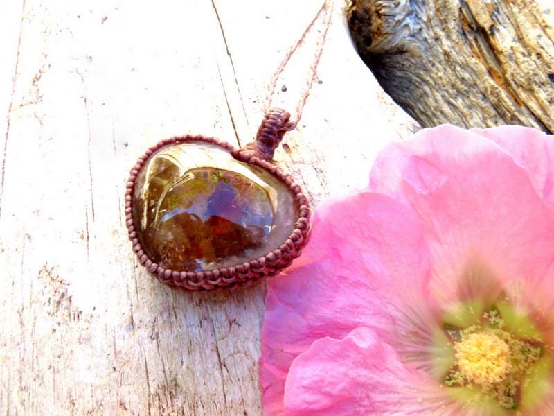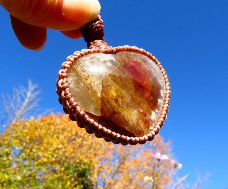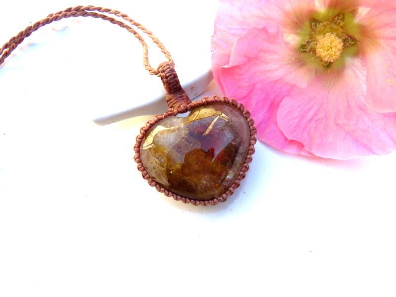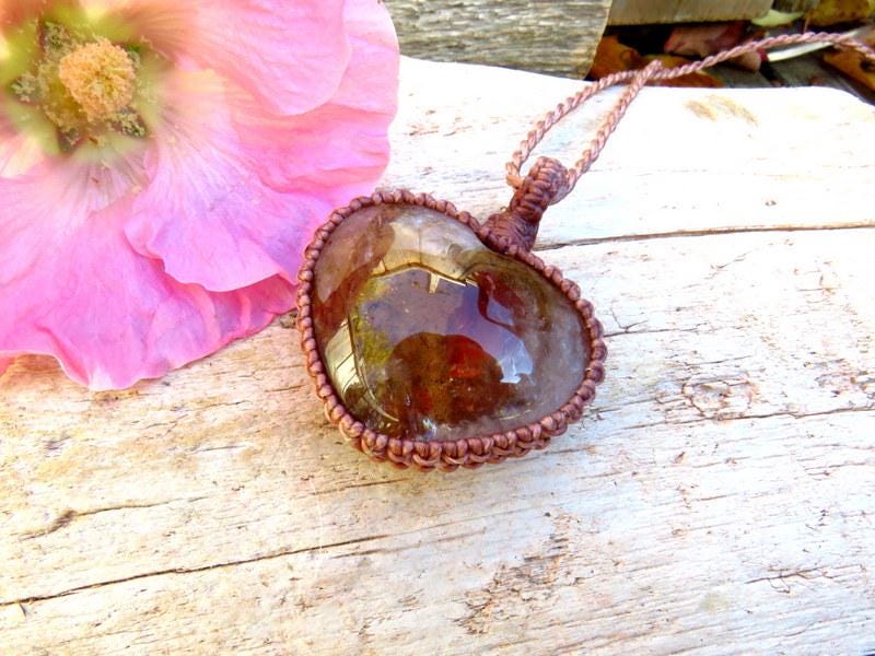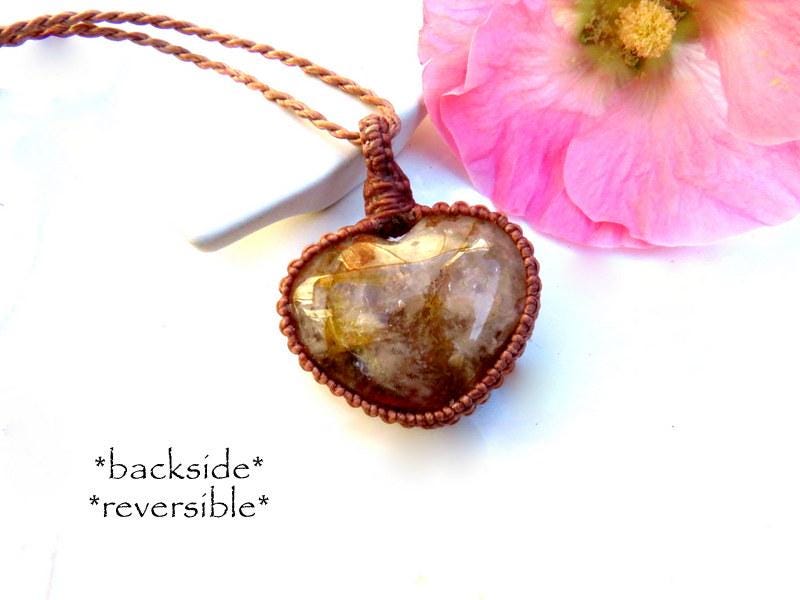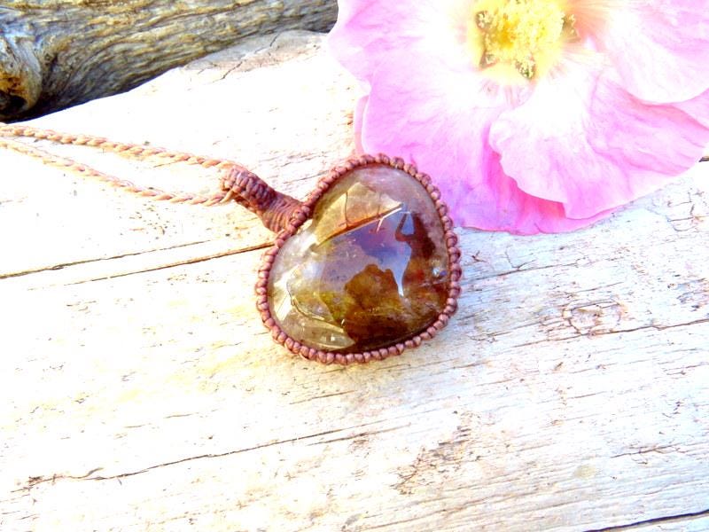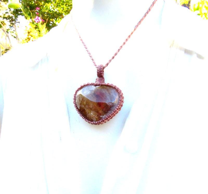 Rare Dendritic Quartz crystal macrame necklace - A gorgeous variety of Quartz filled with dendritic inclusions - an incredible, ethereal world inside and a grounding, earthy brown color with splashes of earthy, burgundy red - carved into a beautiful heart shape. 🤎