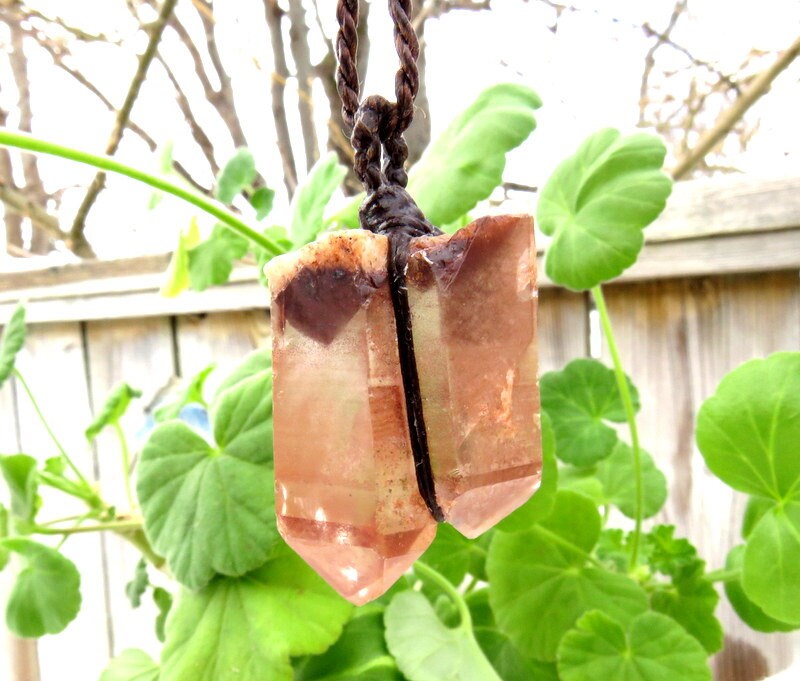 Materials: quartz, crystal, gemstone, red phantom quartz, ishuko quartz, waxed cord.