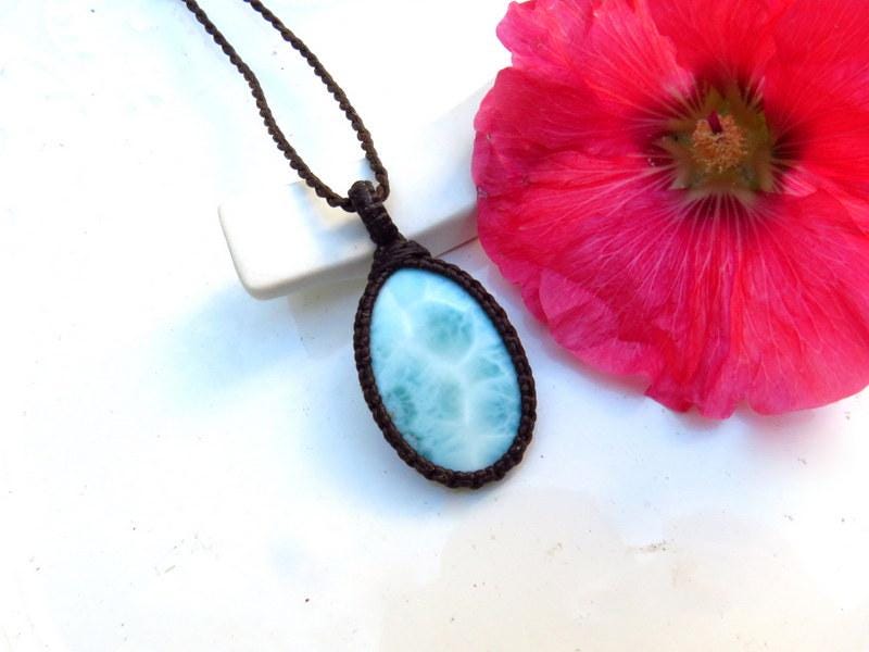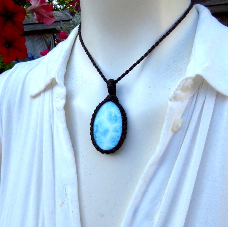 🐬PEACE, LOVE & SERENITY 🐬Superb quality! Larimar macrame necklace - Reminiscent of a rippling Caribbean blue-green sea - Also known as the 'Dolphin Stone' - Besides its alluring colour, Larimar is a also a powerful and energetic stone ! This piece is a lovely tropical blue 💙 The price of Larimar reflects its rarity and how difficult it is to mine. Only found in the Dominican Republic and mined only by hand - in a very difficult area to access- Larimar is considered to be among the rarest gemstones in the world. Psychic Edgar Cayce (1877 - 1945). predicted that on one of the Caribbean islands a blue stone would be found with extraordinary healing attributes and it is believed that Larimar is the stone that Cayce was speaking of. **You will receive the exact Larimar in photos #1-6 and the video.