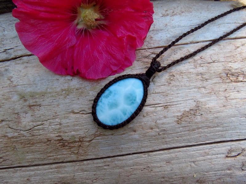 Materials: larimar, gemstone, semiprecious stones, waxed cord, dolphin stone, pectolite.
