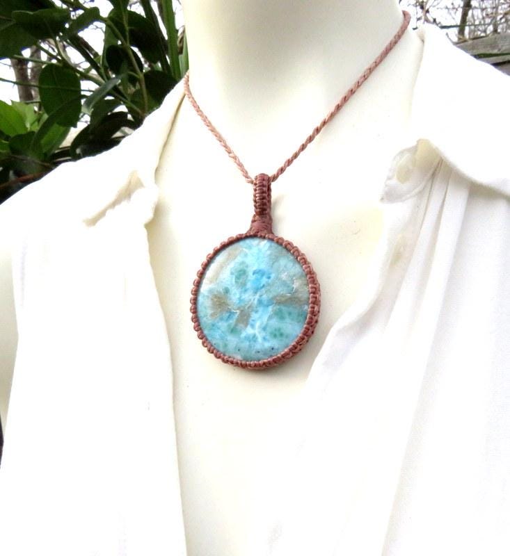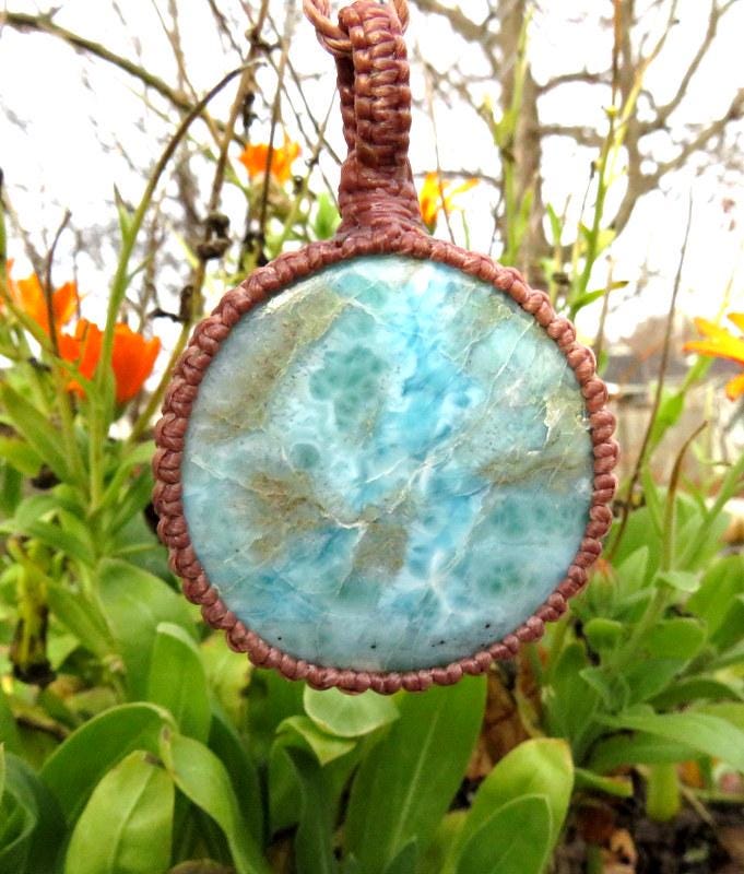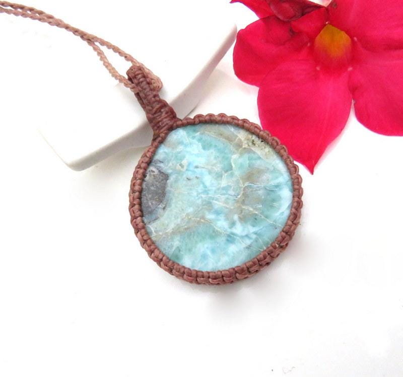 🌊💙PEACE, LOVE & SERENITY 🌊💙 Quality Larimar macrame necklace - Reminiscent of a rippling Carribbean blue sea - Also known as the 'Dolphin Stone' - Besides its alluring color, Larimar is a also a powerful and energetic stone ! The price of Larimar reflects its rarity and how difficult it is to mine. You will receive the exact stone in photos #2-8 and the video. Only found in the Dominican Republic and mined only by hand - in a very difficult area to access- Larimar is considered to be among the rarest gemstones in the world. Psychic Edgar Cayce (1877 - 1945). predicted that on one of the Caribbean islands a blue stone would be found with extraordinary healing attributes and it is believed that Larimar is the stone that Cayce was speaking of.