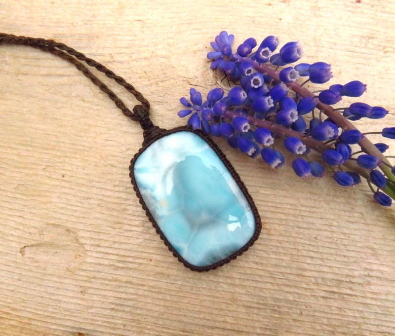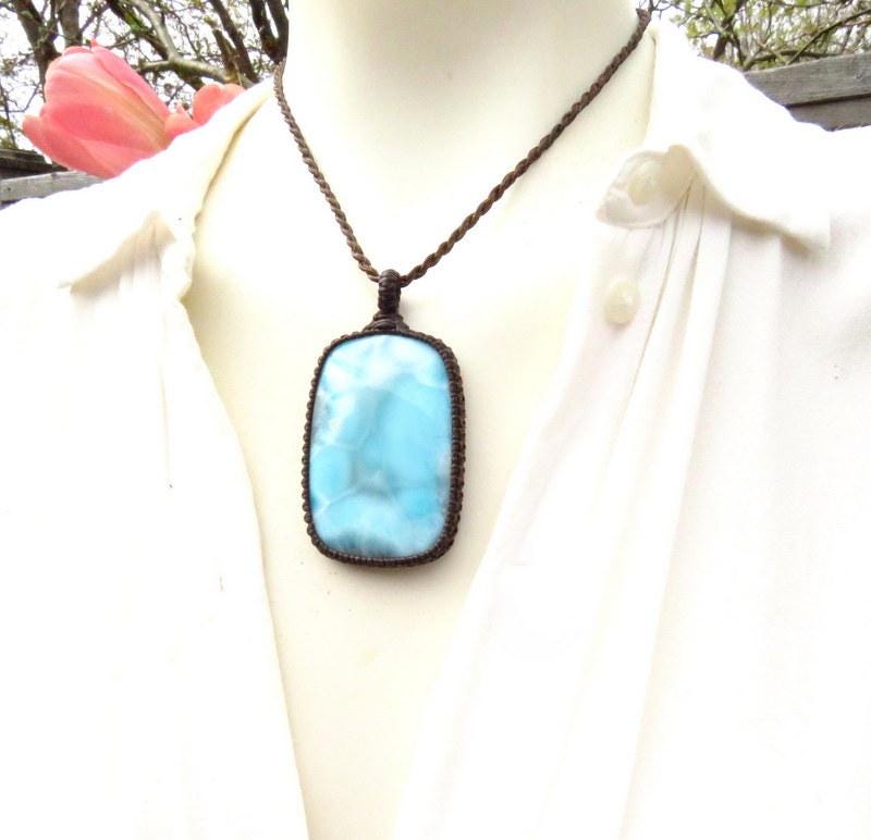 ✨PEACE, LOVE & SERENITY✨ Magnificent Larimar macrame necklace - Also known as the 'Dolphin Stone' - the prettiest Caribbean blue with its distinctive honeycomb pattern that resembles rippling ocean waves - only found in the Dominican Republic and mined only by hand - in a very difficult area to access- Larimar is considered to be among the rarest gemstones in the world. Psychic Edgar Cayce (1877 - 1945). predicted that on one of the Caribbean islands a blue stone would be found with extraordinary healing attributes and it is believed that Larimar is the stone that Cayce was speaking of. ✨ You will receive the exact stone in photos: #1-6(model is wearing a different Larimar)