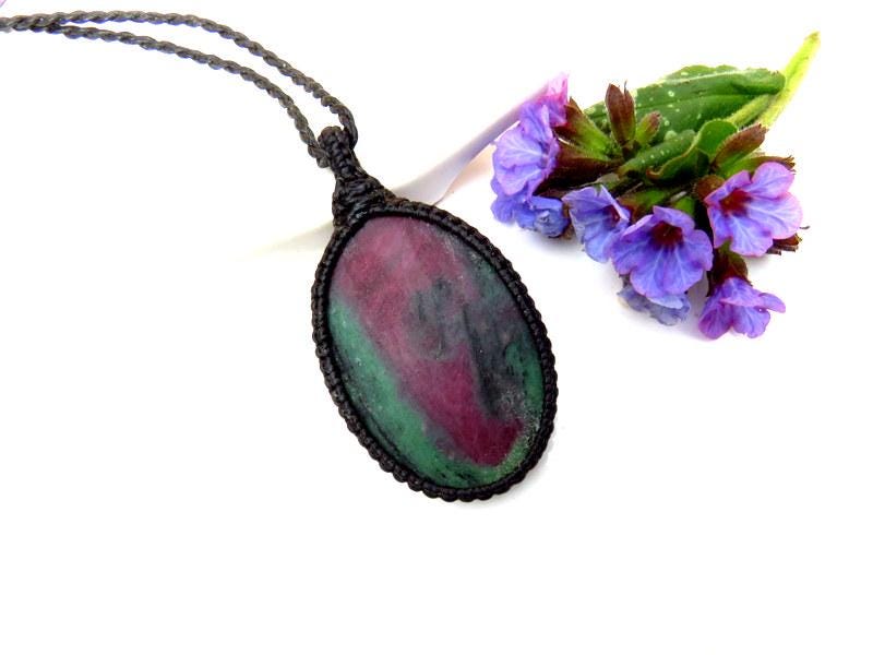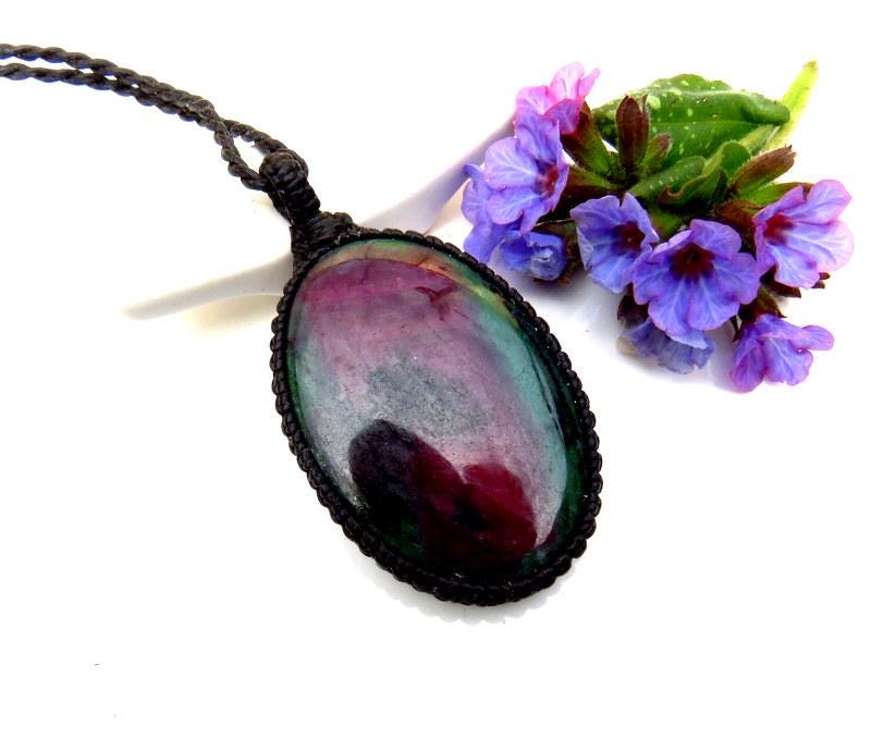 Gorgeous Ruby Zoisite Macrame Necklace - Lovely Ruby Zoisite gemstone with a large Ruby inclusion - classic oval shape and a very generous size - its energy is unique and comforting and is one of our favorites !🌺