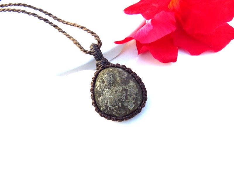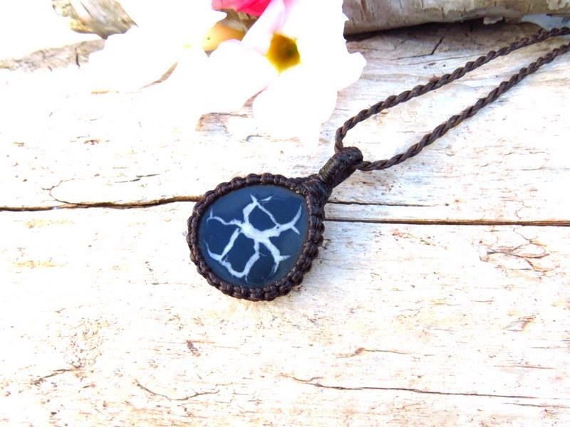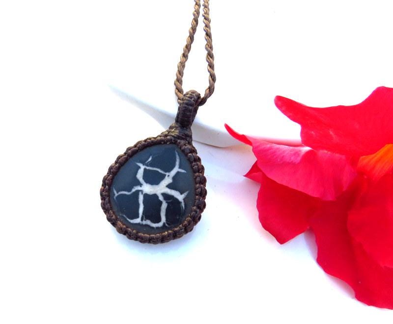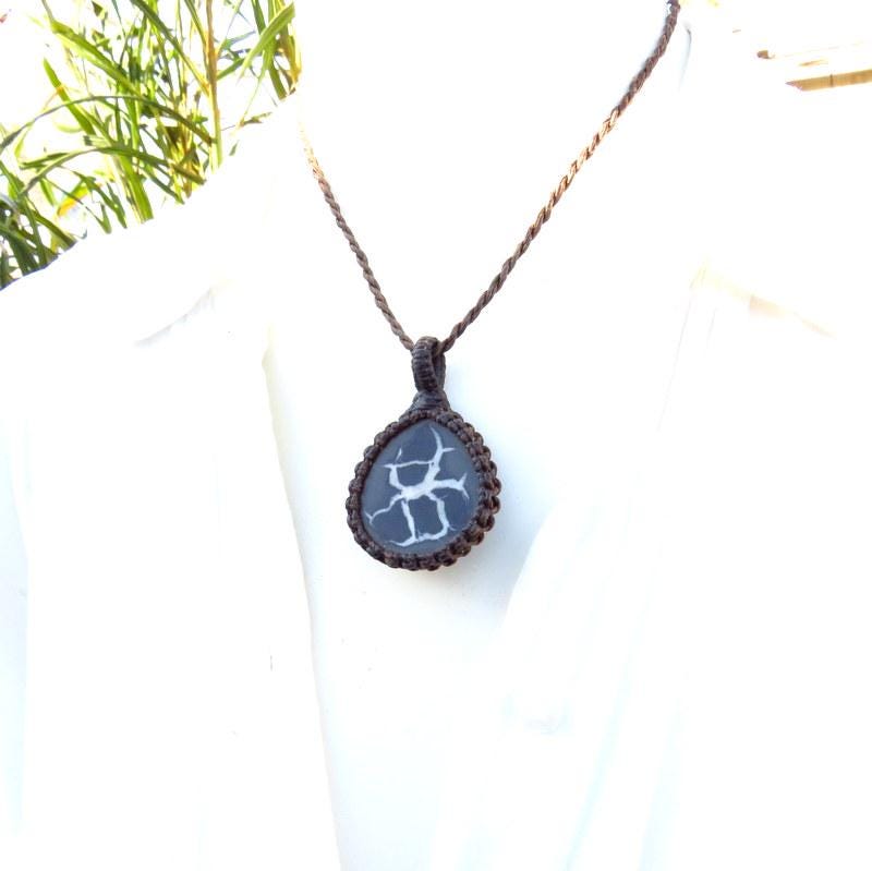 Unique Septarian Nodule macrame necklace - These intriguing pieces were formed 50 - 70 million years ago ! They contain cavities called ' septaria ' which are made up of ancient sea life and sediment. Also known as 'Dragon Stone .' This piece is an earthy brown and grey with a very intriguing formation - You will receive the exact stone in photos #1-7 and the video (*model is wearing a different Septarian)