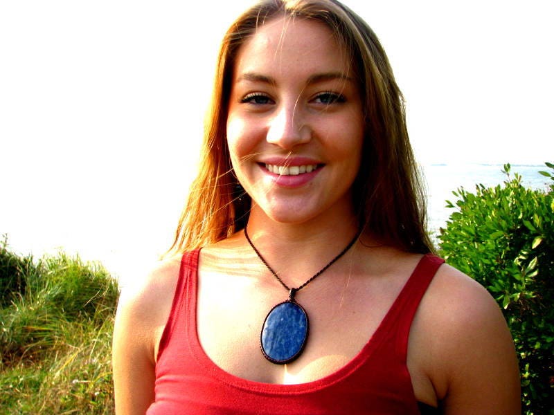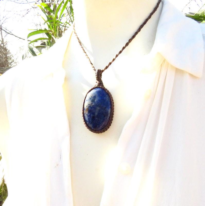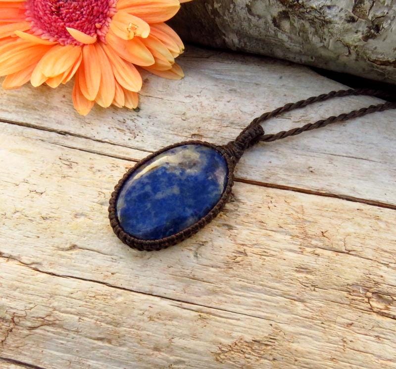 retty Sodalite Macrame Necklace - Deep denim blue and gray - classic oval shape - earthy chic ! You will receive the exact stone in photos #2-7 and the video.