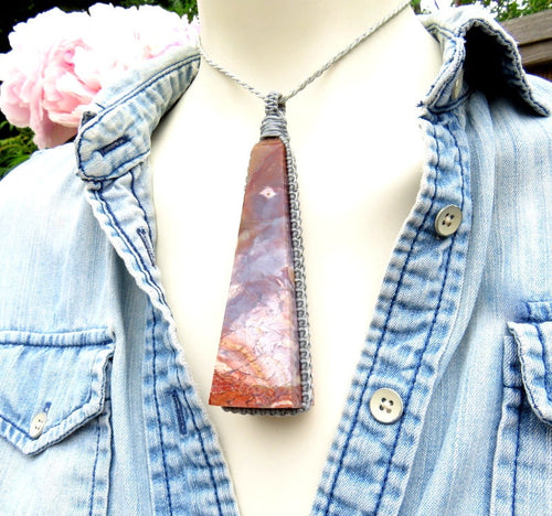 This listing is a beautiful, colorful Chalcedony macrame necklace. Soothing, earthy colors - light purple, gray and burgundy wine - with lovely patterns!