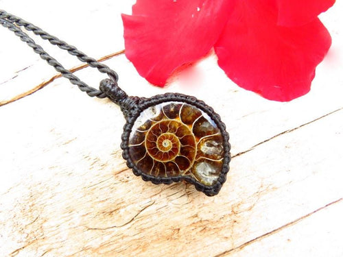 Beautiful Ammonite necklace - So fun to gaze at the spiral rays and imagine sea life 400 million years ago. The Ammonite macrame necklace is a stunning marriage of history and artistry. This unique piece features an Ammonite fossil, intricately woven into a macrame setting. This Ammonite necklace is like wearing a piece of our ocean's history that has been ✨macrame-magically✨ transformed into a conversation piece! A testament to the beauty of the past adorning the present.💗 In addition, the backside of this piece has a gorgeous green flash!