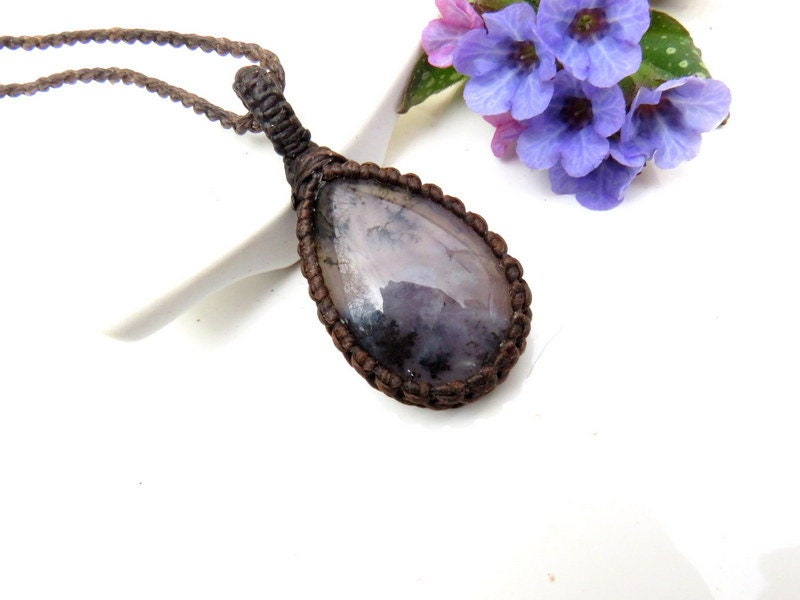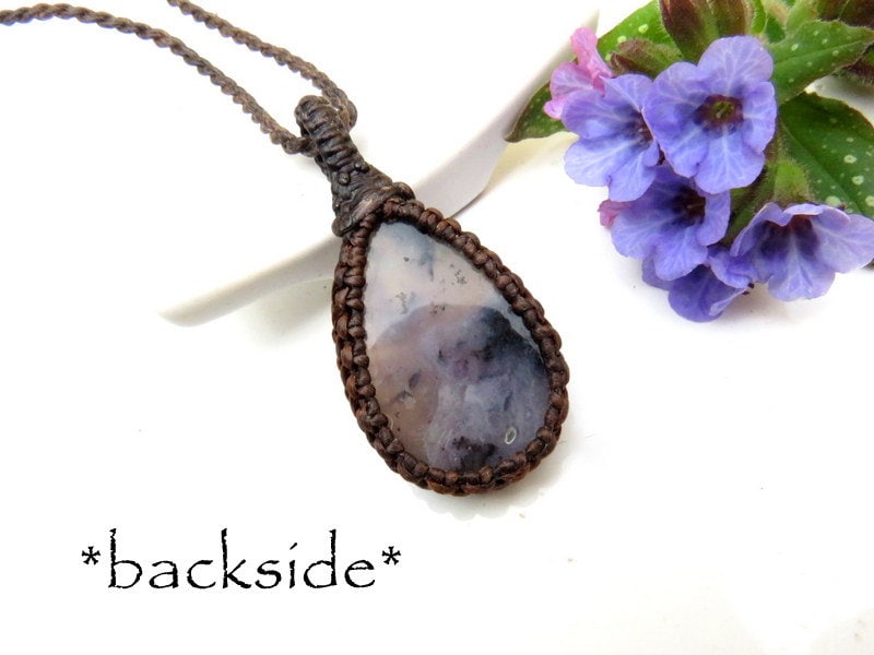 Enchanting 💜 Purple Sage Agate Necklace - translucent mauve with intricate black plumes - resembling pressed flowers - beautiful, shiny polish, classic teardrop shape. Excellent quality !