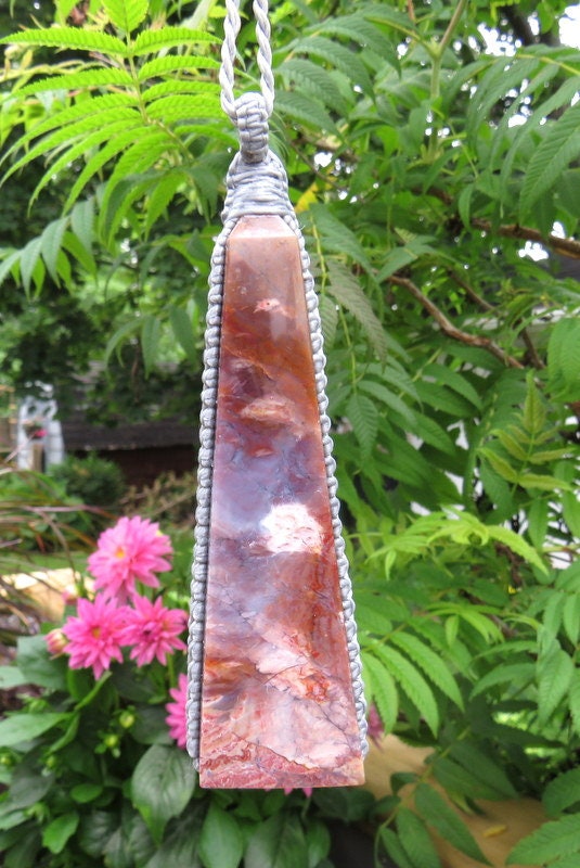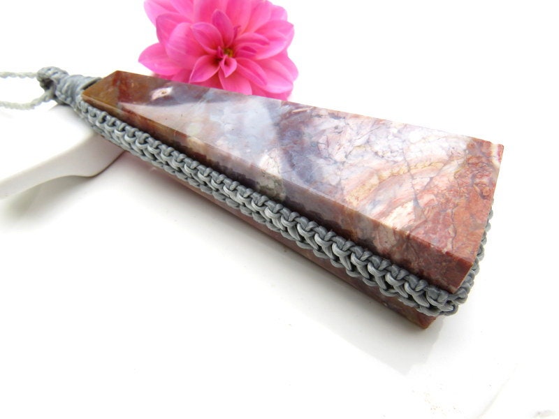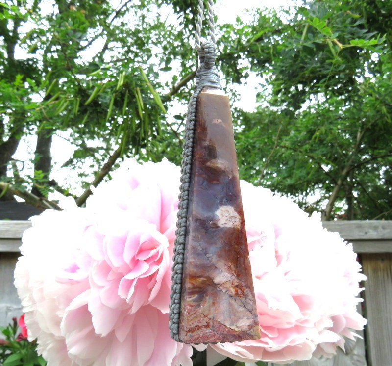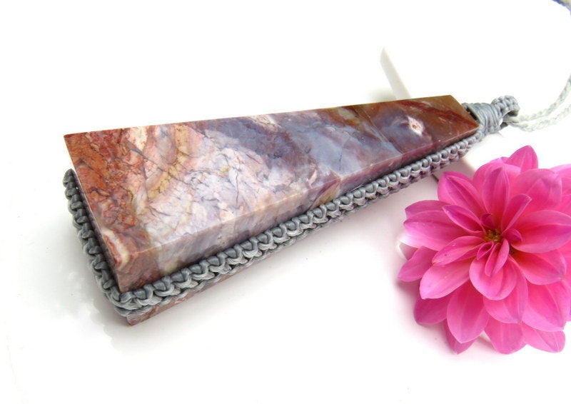 This listing is a beautiful, colorful Chalcedony macrame necklace. Soothing, earthy colors - light purple, gray and burgundy wine - with lovely patterns!