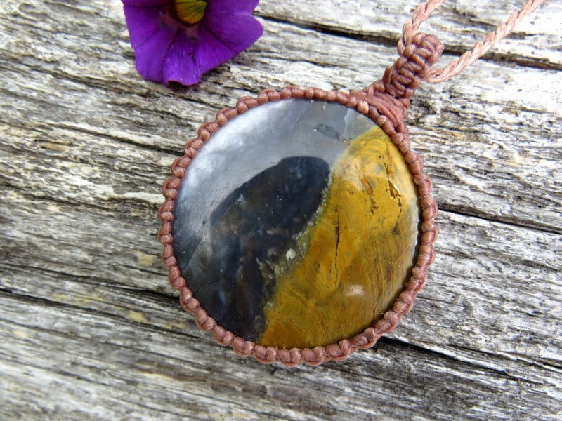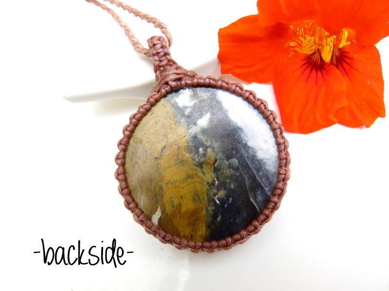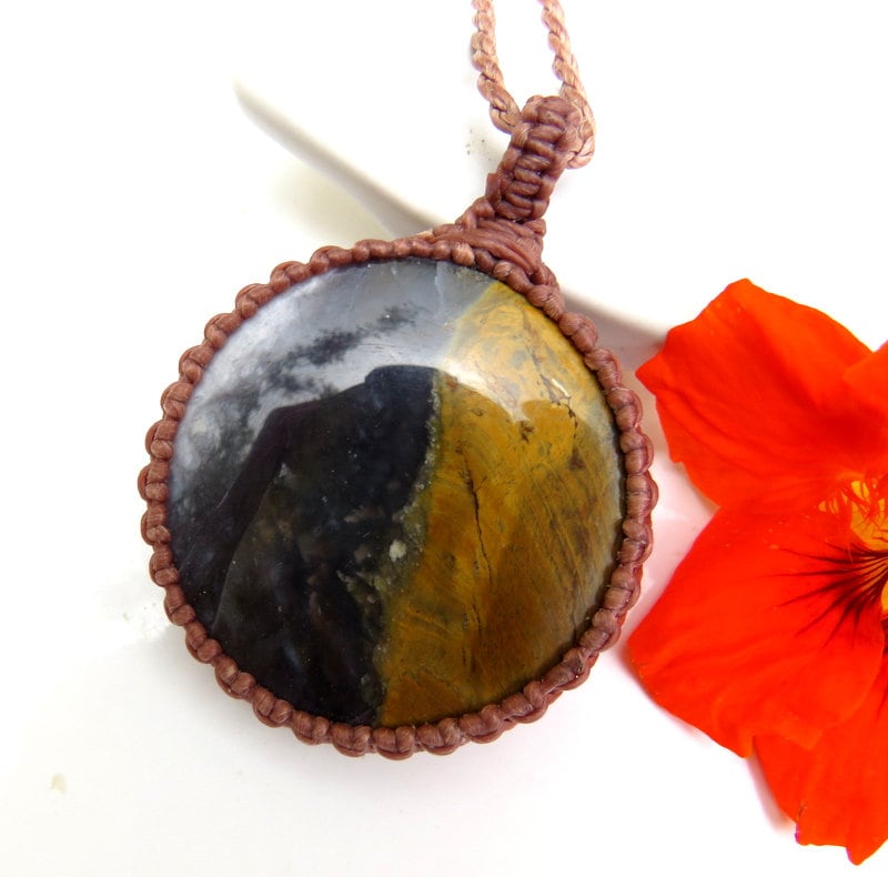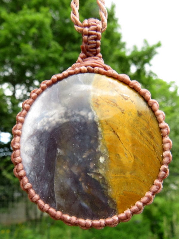 💜BROTHER/SISTERHOOD & GOOD WILL 💜Unique , dreamy deep Purple with mustard yellow Chalcedony macramé necklace - generous size and lovely energy ! From Indonesia