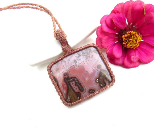This listing is for a beautiful Turkish Agate macrame necklace - The pattern, the colors - its is perfection 👌 A soft peachy pink very intriguing plumes and patterns - One of a kind!